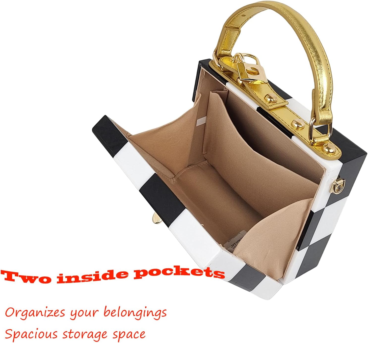 - ❤❤Attractive & Stylish Design.❤❤ This is HUANG ZHUANG Brand. Made of environmental Acrylic, Black and white stripe spaced box clutch. Cool pattern,Black and white Checkerboard, they are the most popular elements at the moment.Match your clothes in different colors and styles, be a different version of yourself.