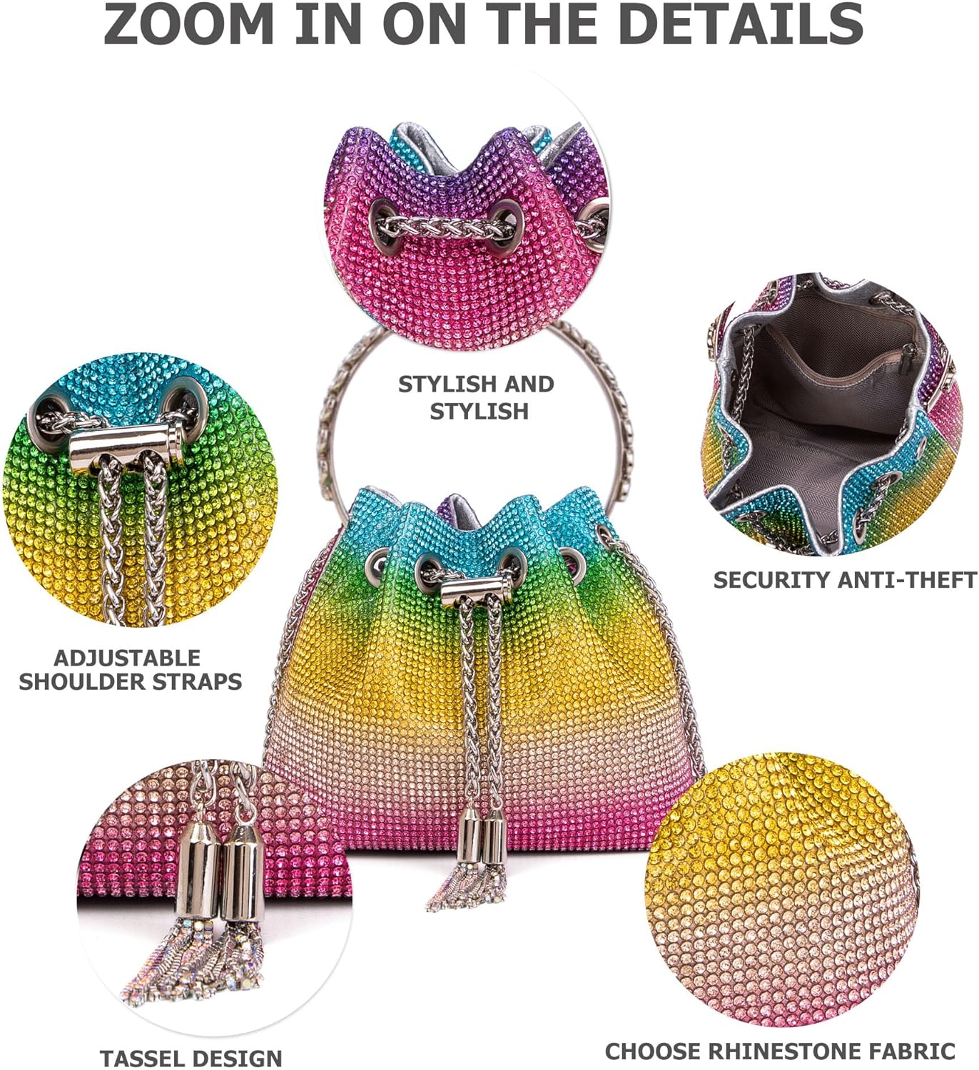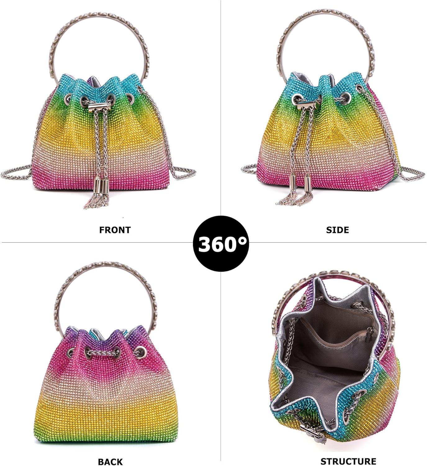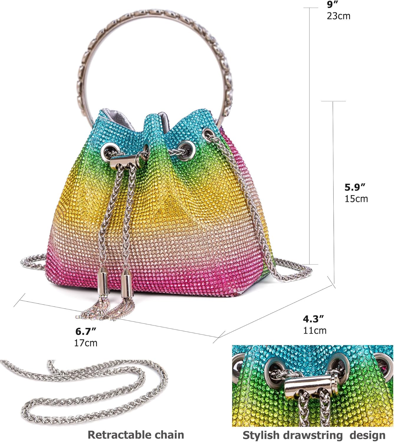 - Tassel & Drawstring Design: Protect your bag with a tassel hook & drawstring and tensioning the chain securely. The length of bling purse can be adjust you want, use it as a crossbody bag or shoulder bag; also use metal diamond handle as a clutch purse, handbag.