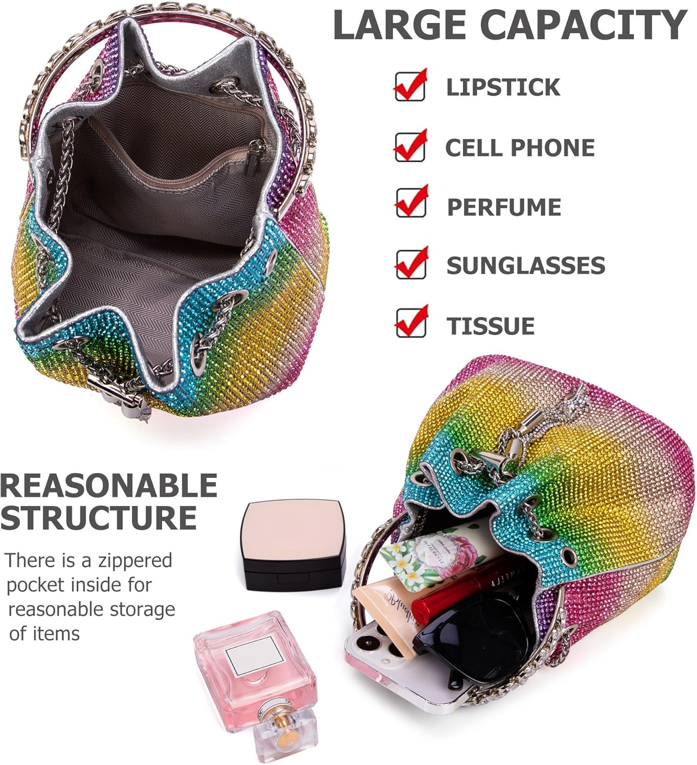 - Structure: Size: 6.7" x 4.3" x 5.9" / 17cm x 11cm x 15cm. This fashion shimmering rhinestone purse can hold your daily essentials like cell phone, lipstick, make ups, mini earphones, small wallet, sunglasses, keys etc.