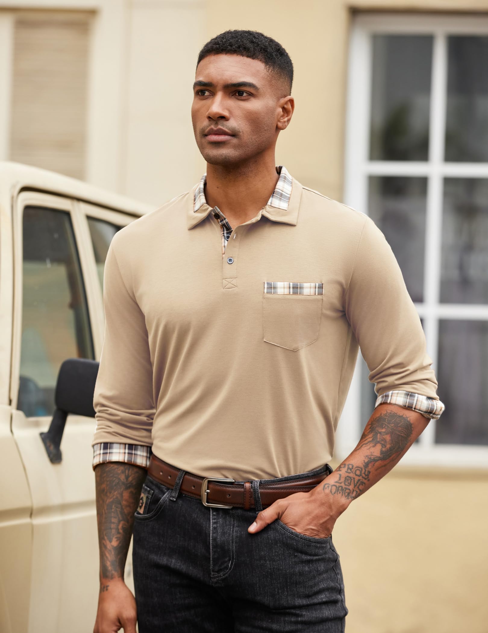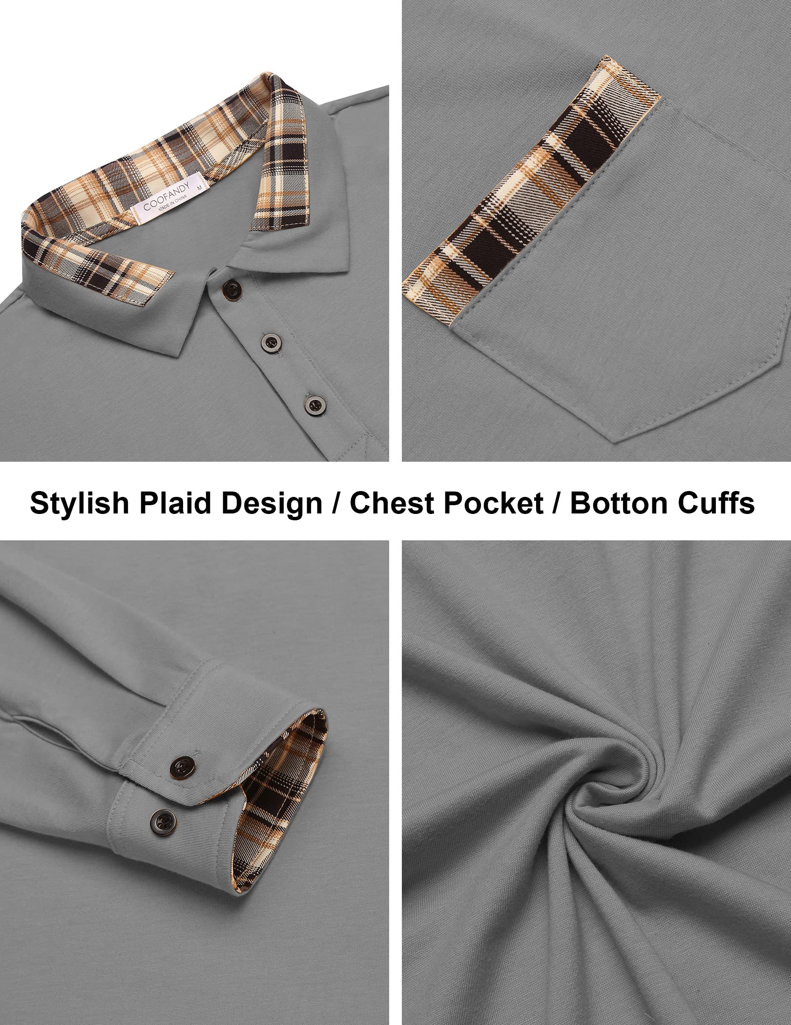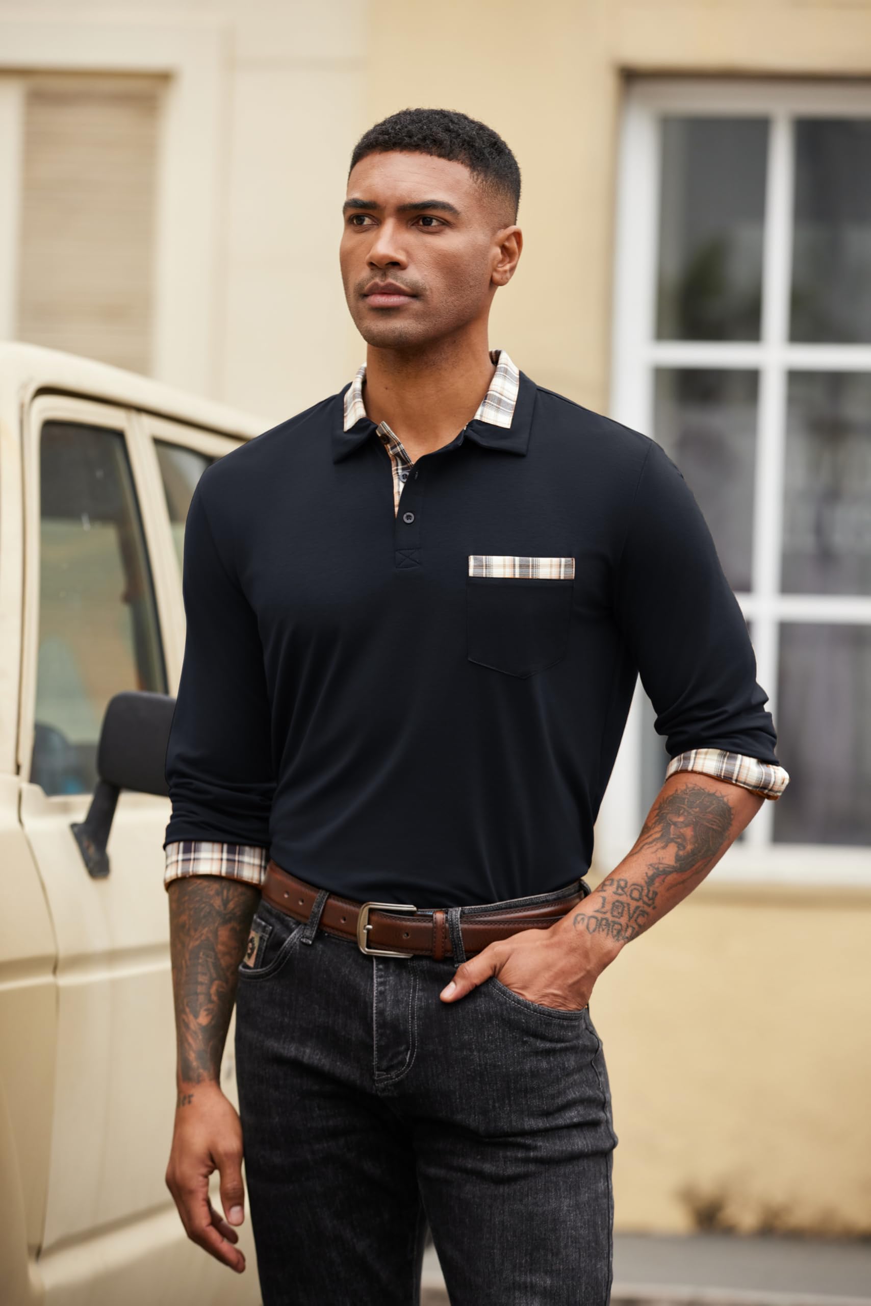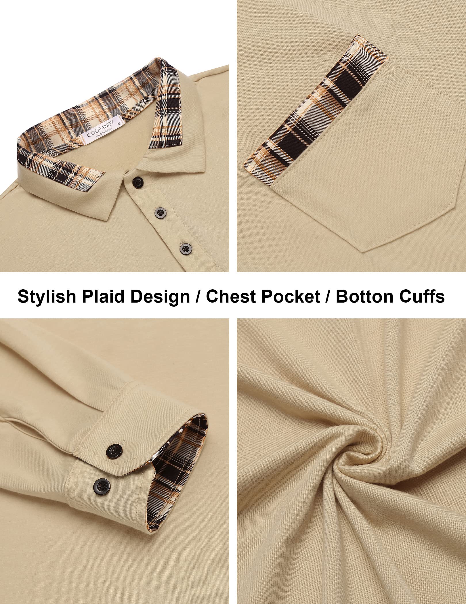 - Men's Cotton Polo T Shirts: Long-sleeve polo shirt is made of high quality Fabrics- cotton blend, featuring three-button placket and chest pocket.