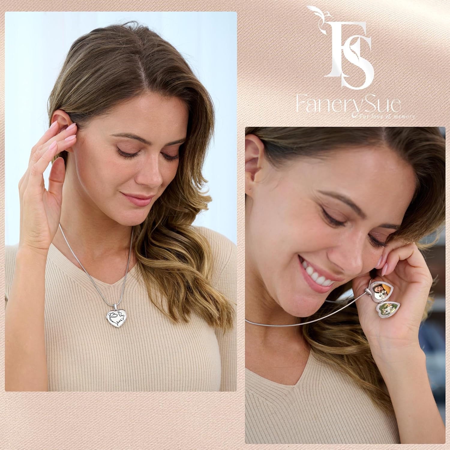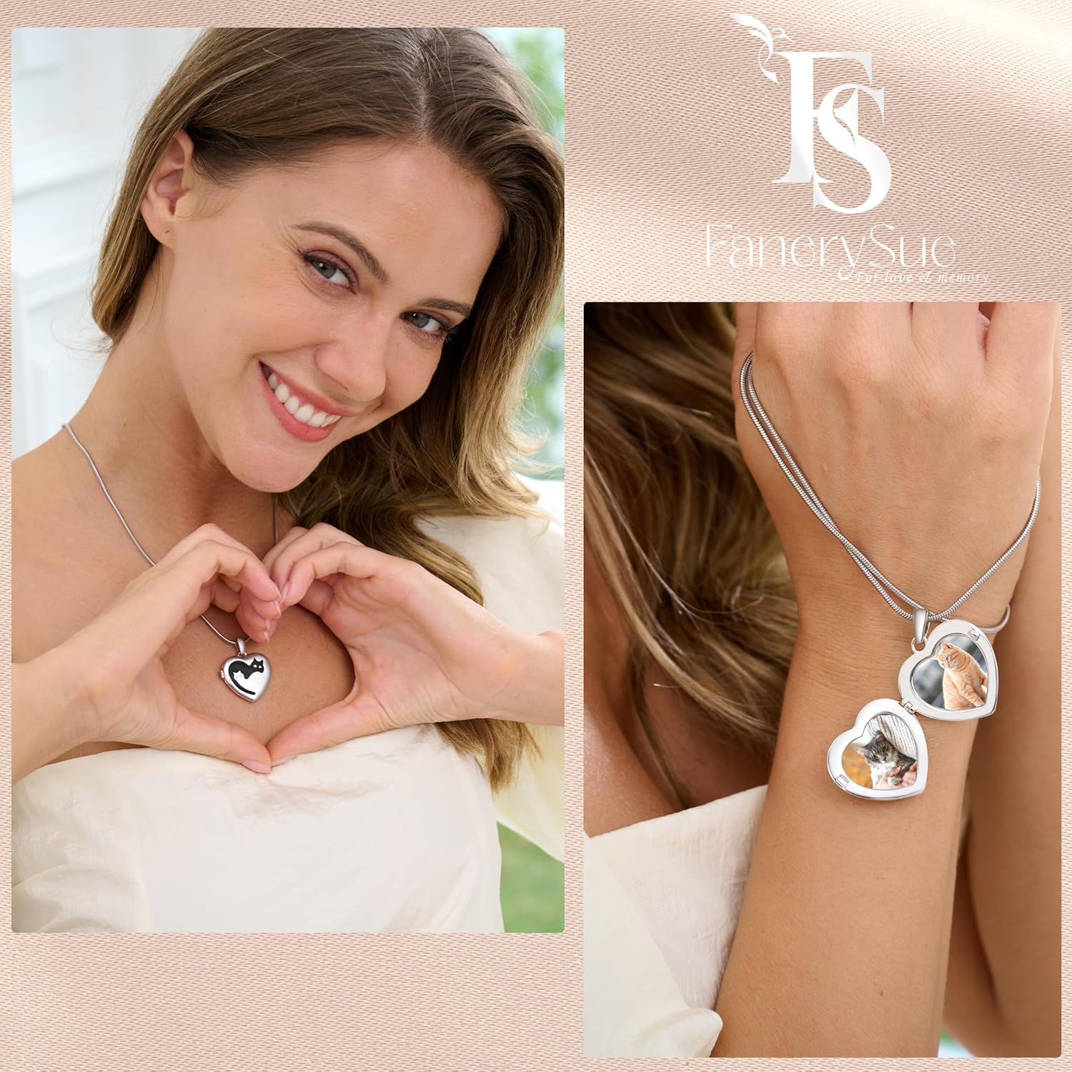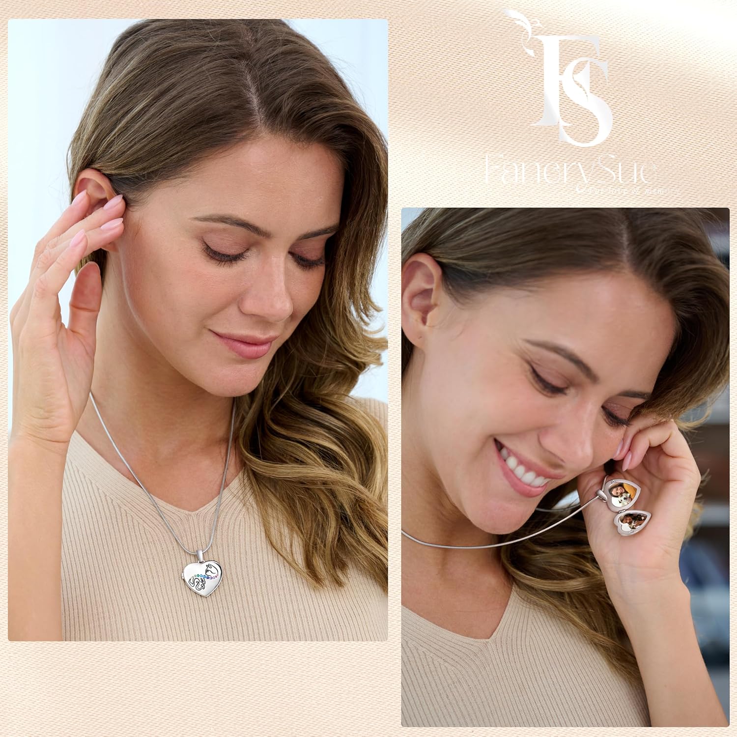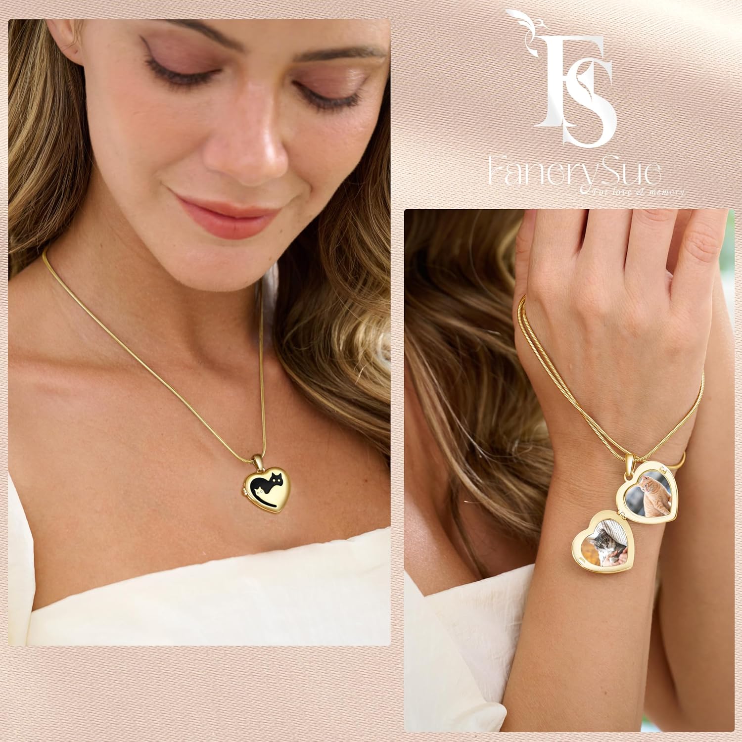 - [Design Concept of Fanery Sue]: The Locket features a heart-shaped design, creating a romantic and sentimental ambiance. It serves as a delicate accessory that can hold two cherished photos and can be engraved with special messages or names on the back, making it a truly one-of-a-kind keepsake or gifts