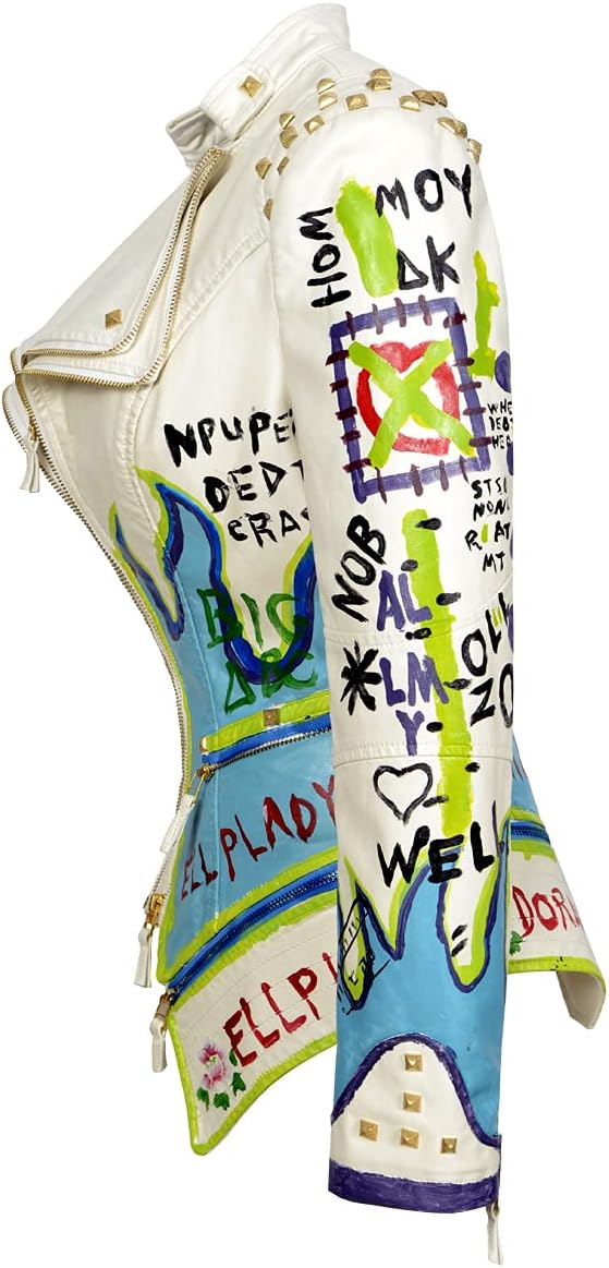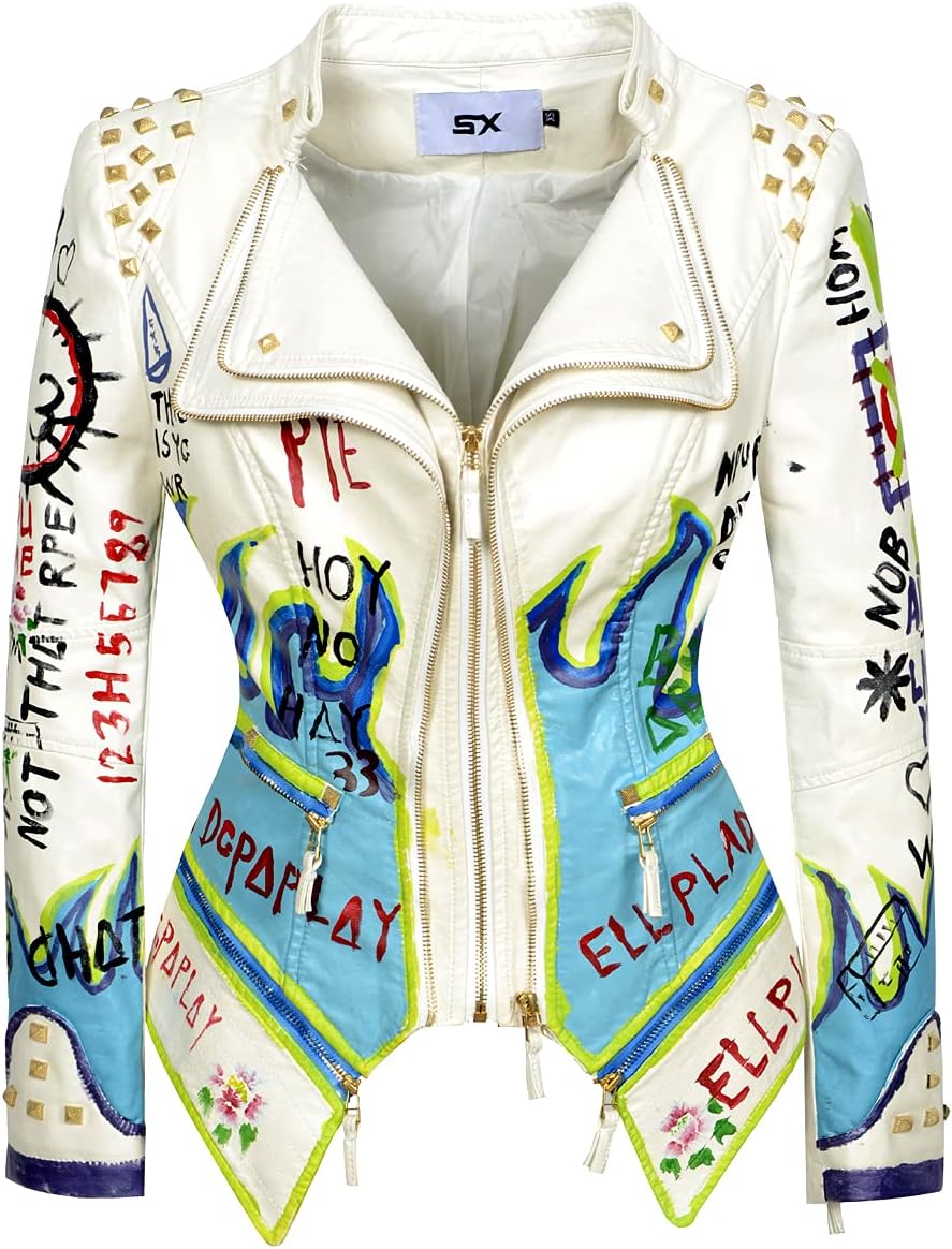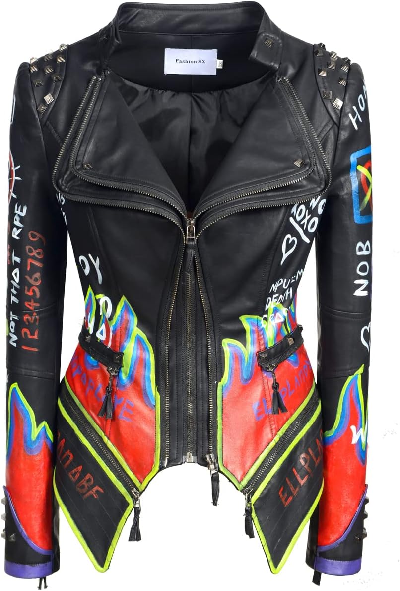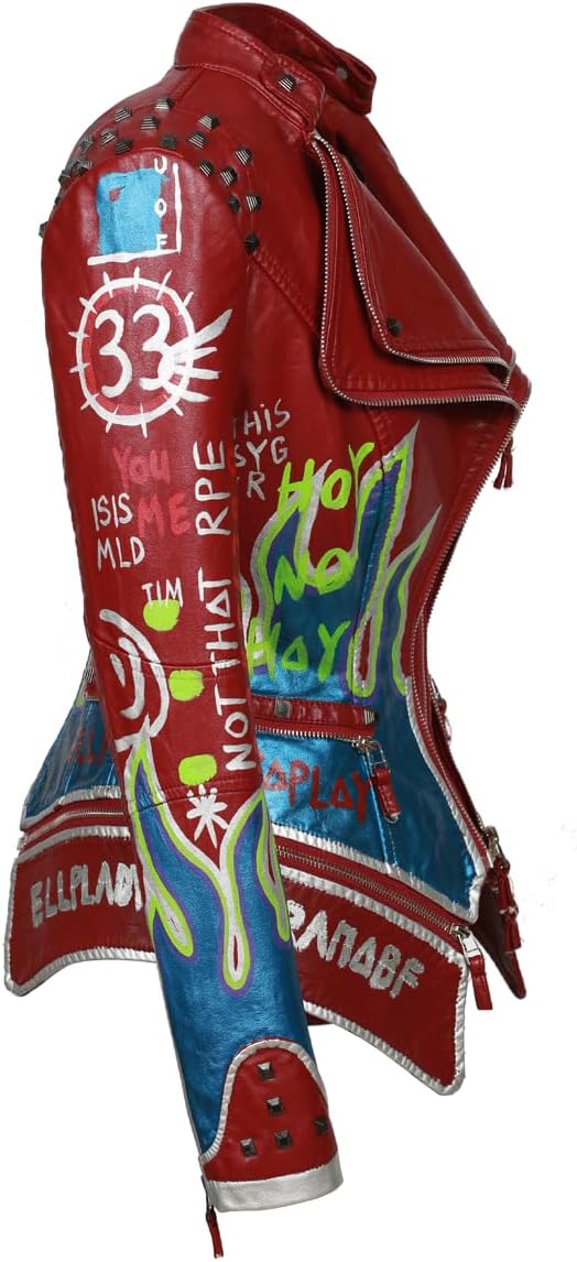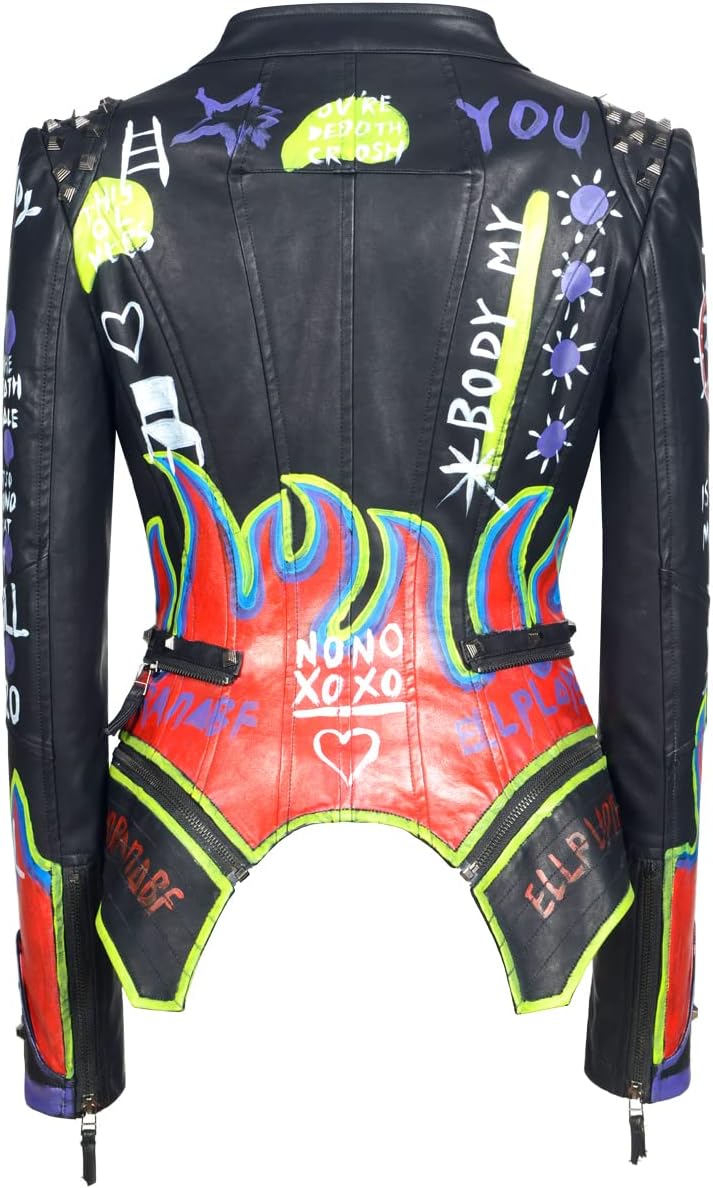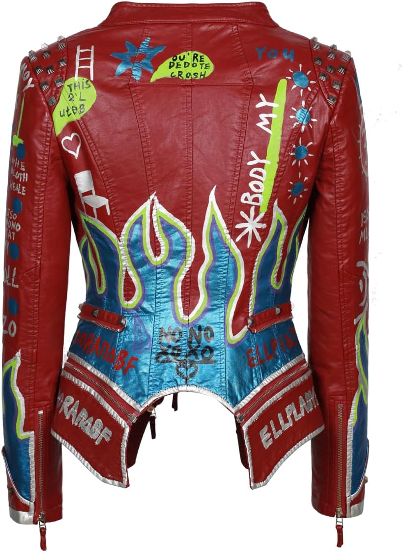 - Women's synthetic leather jacket, double lapel collar and zipper placket, metal rivets at shoulder, cuffs and waist, and beautiful graffiti are more unique, retro and fashionable
