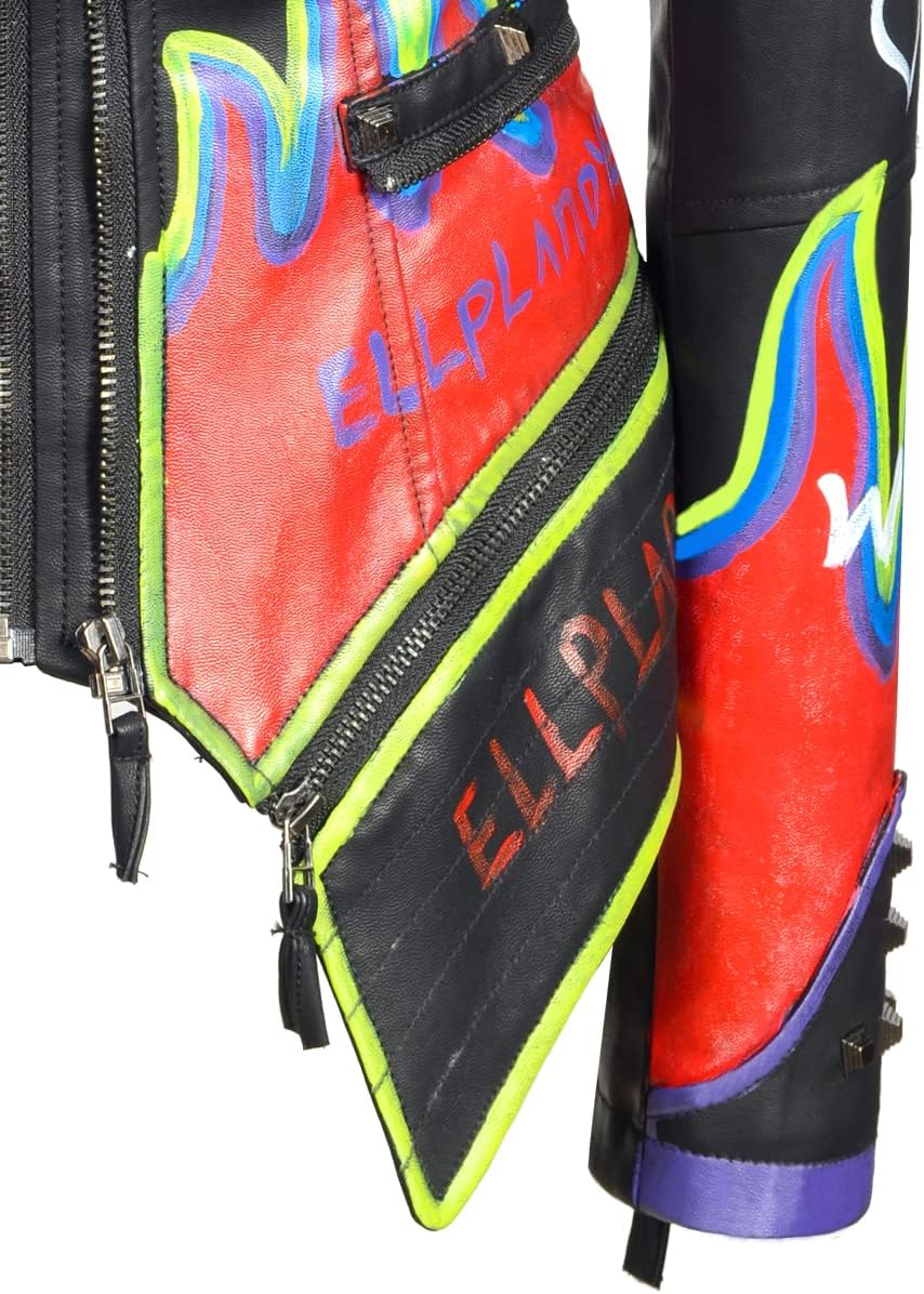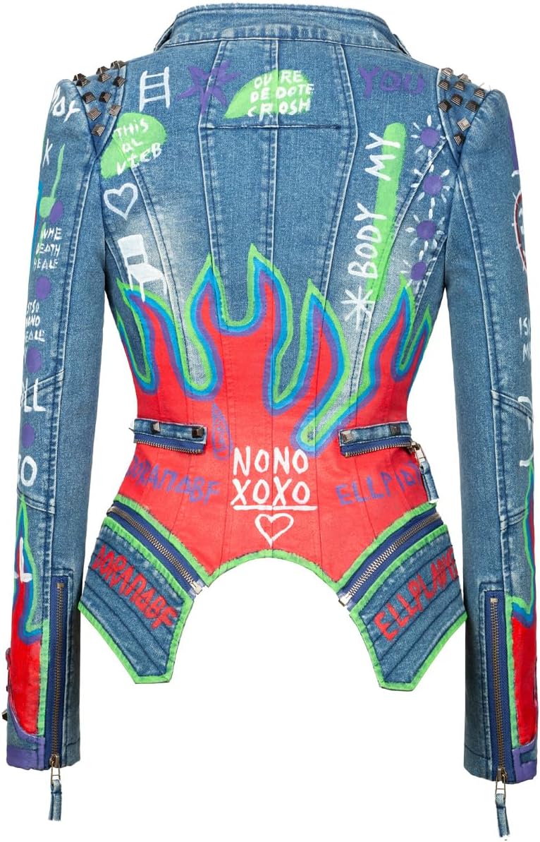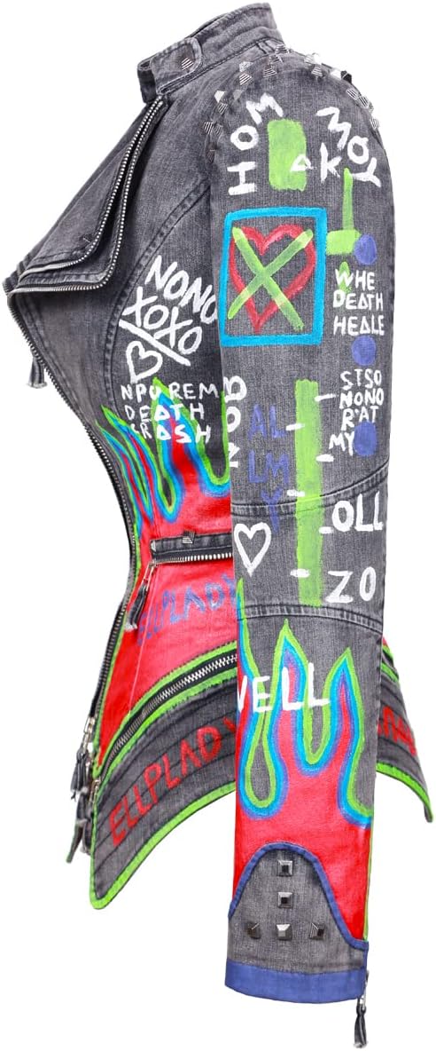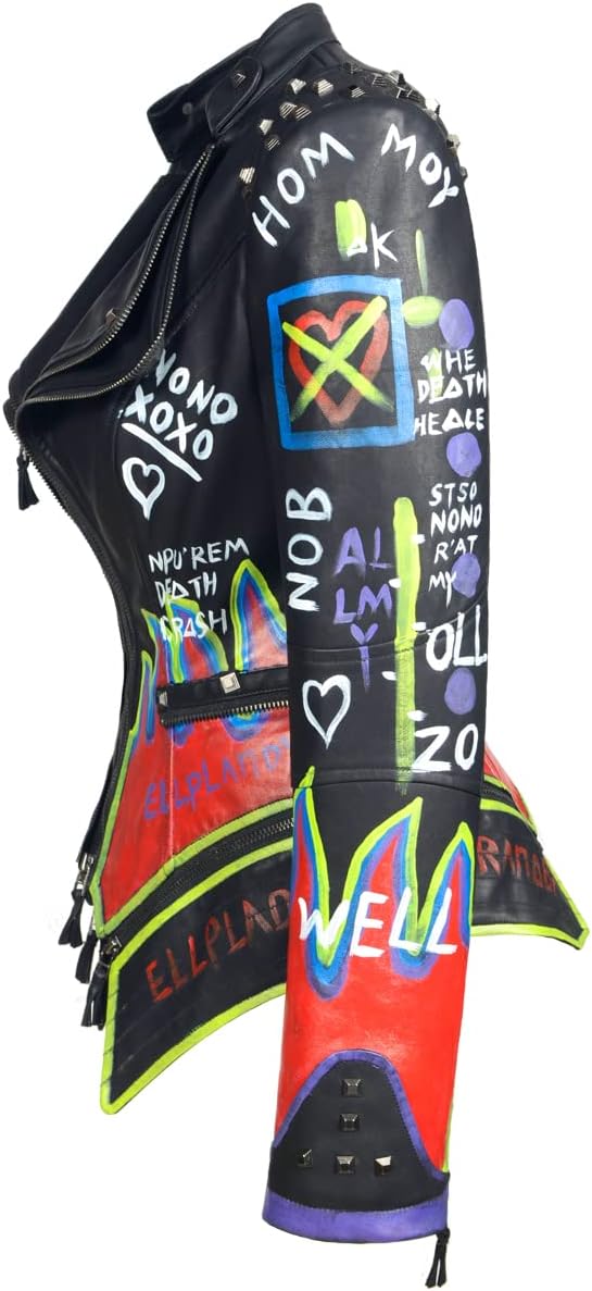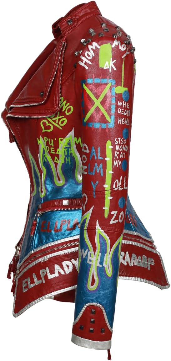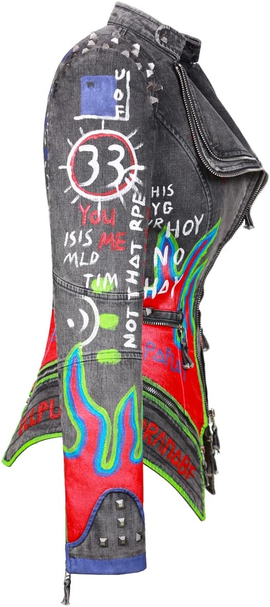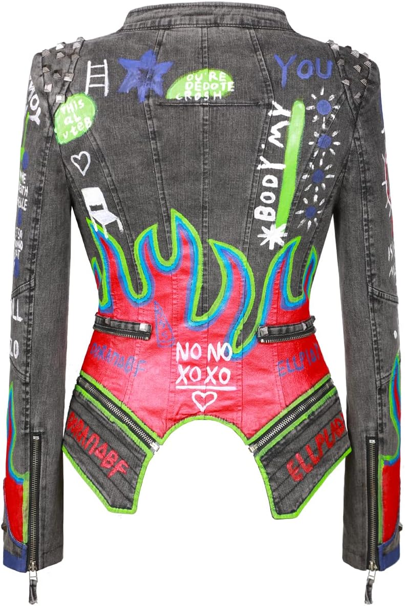 - Women's synthetic leather jacket, double lapel collar and zipper placket, metal rivets at shoulder, cuffs and waist, and beautiful graffiti are more unique, retro and fashionable