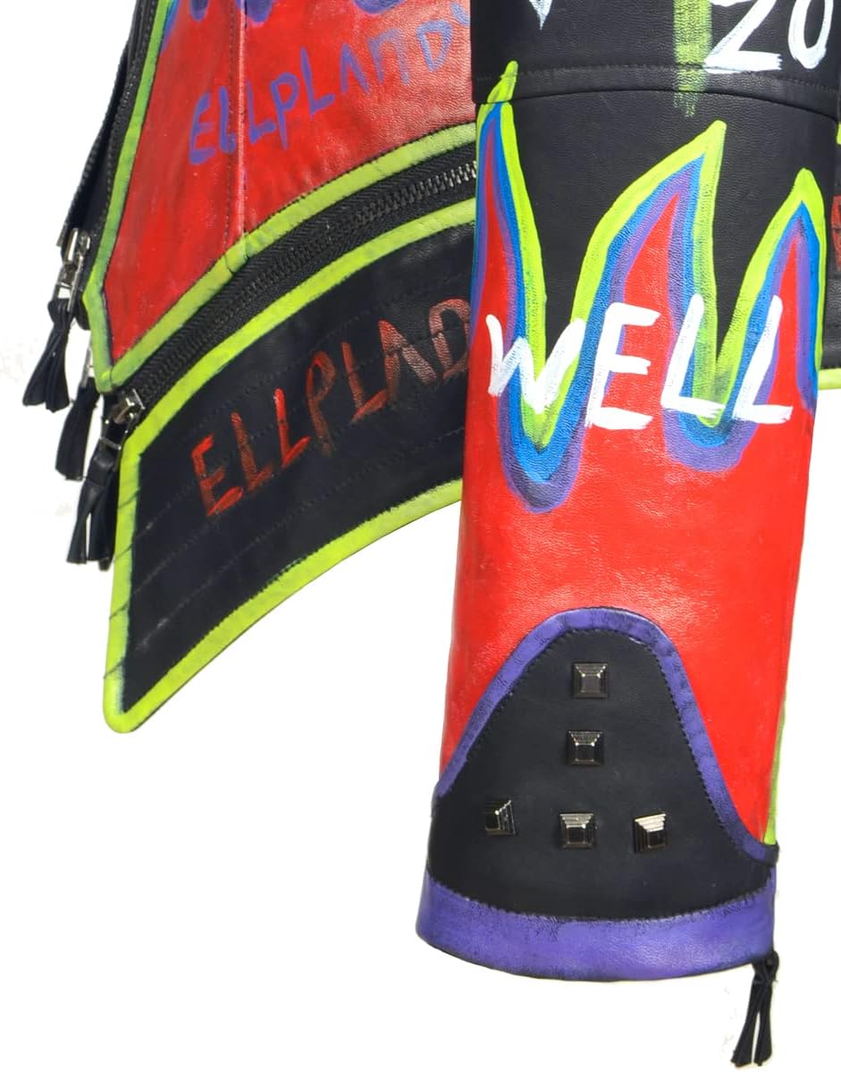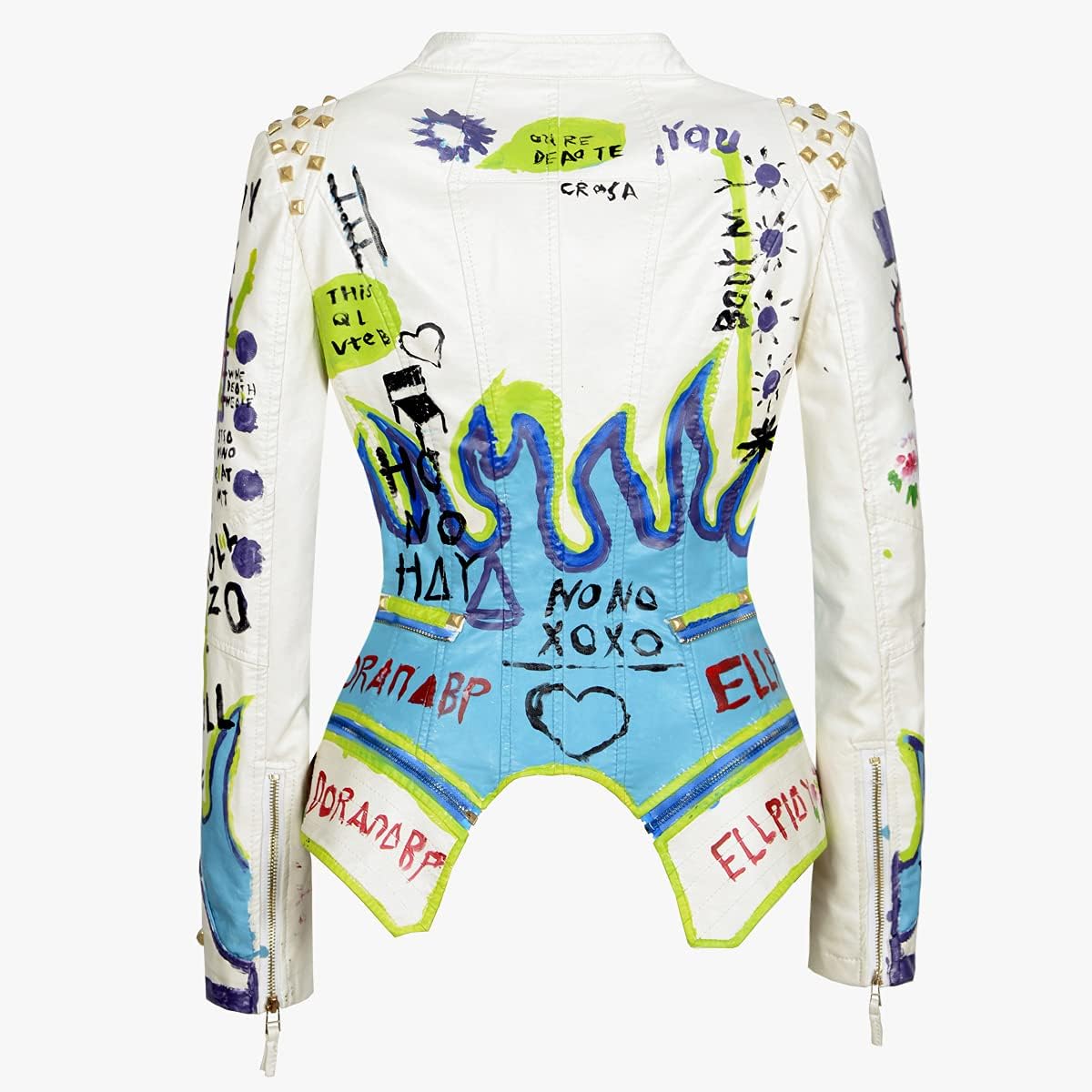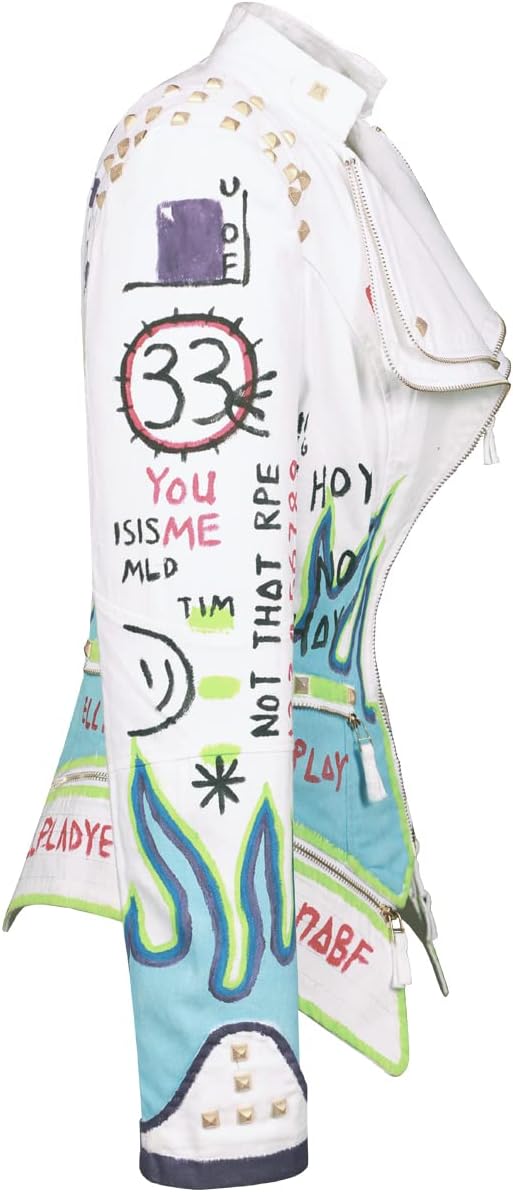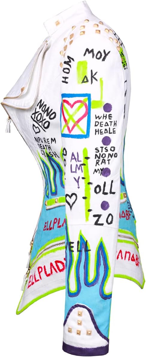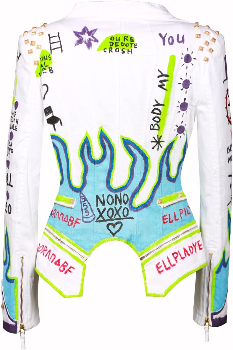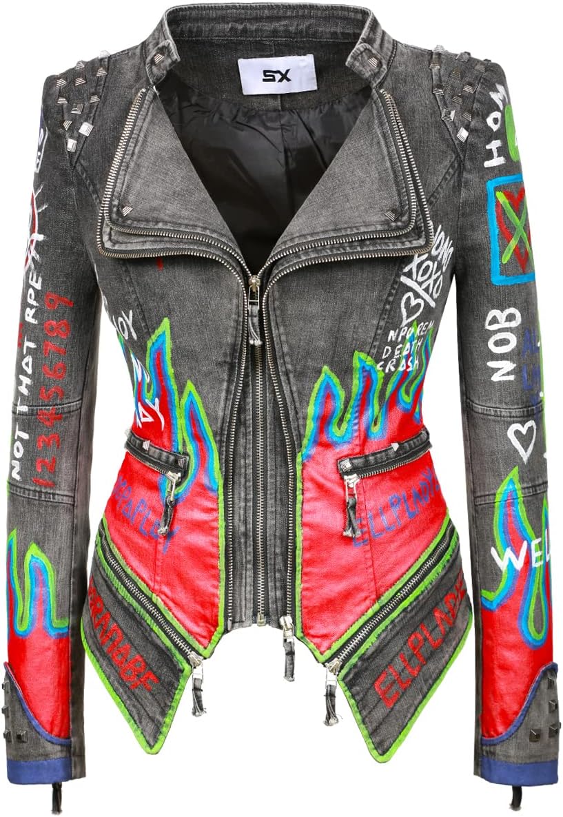 - Women's synthetic leather jacket, double lapel collar and zipper placket, metal rivets at shoulder, cuffs and waist, and beautiful graffiti are more unique, retro and fashionable