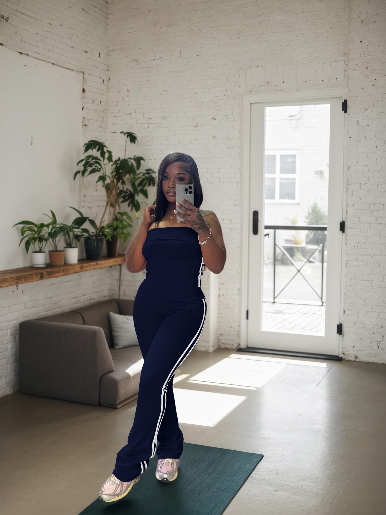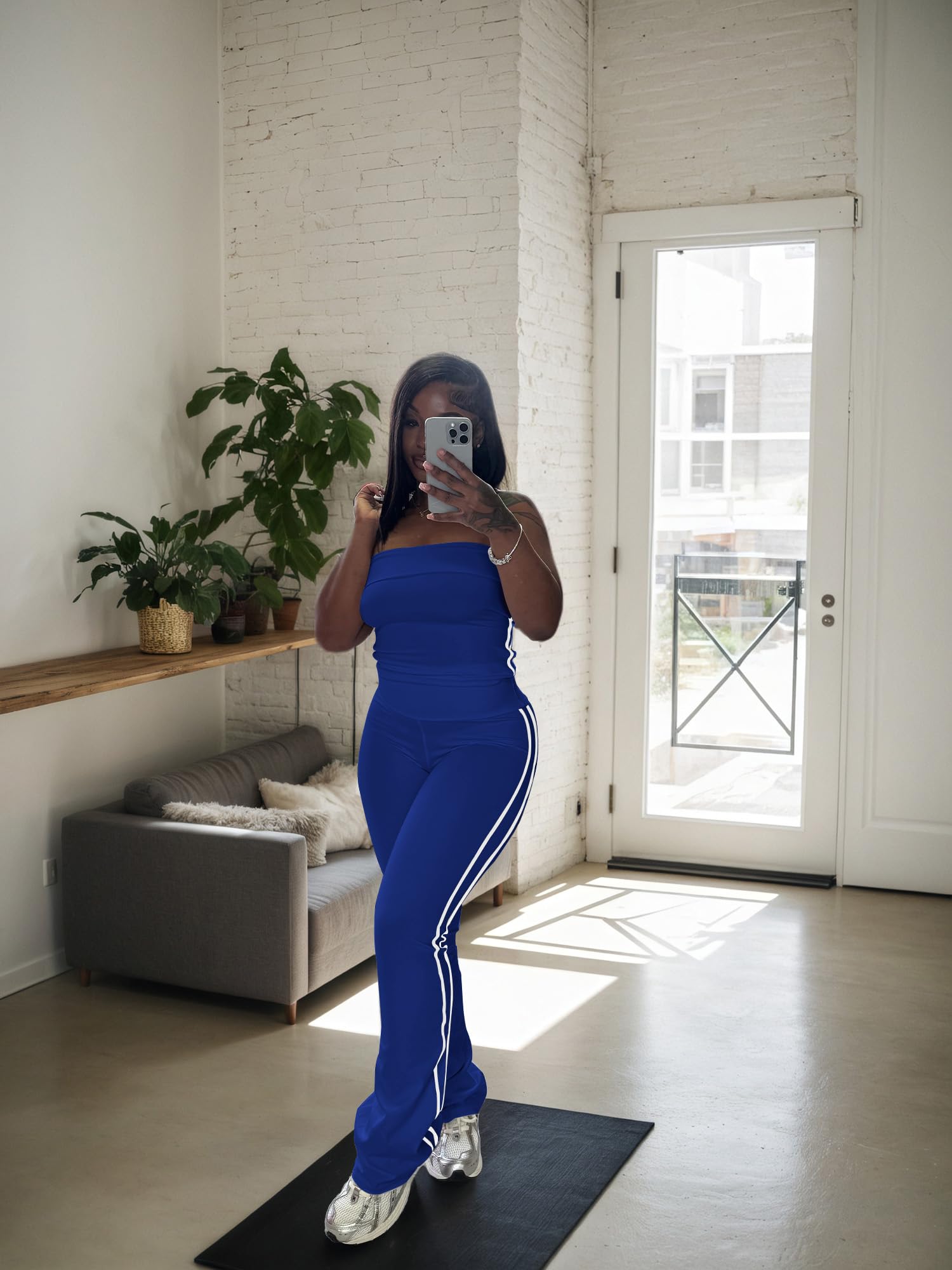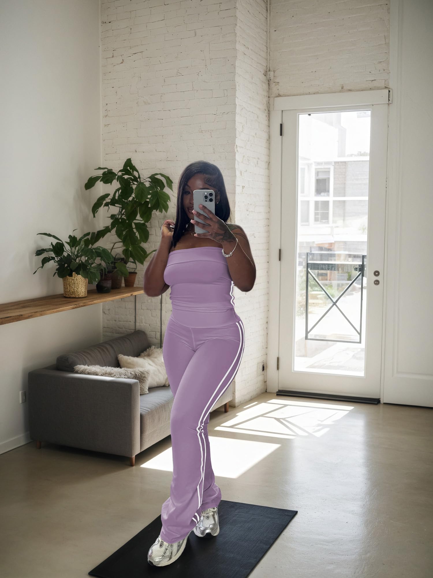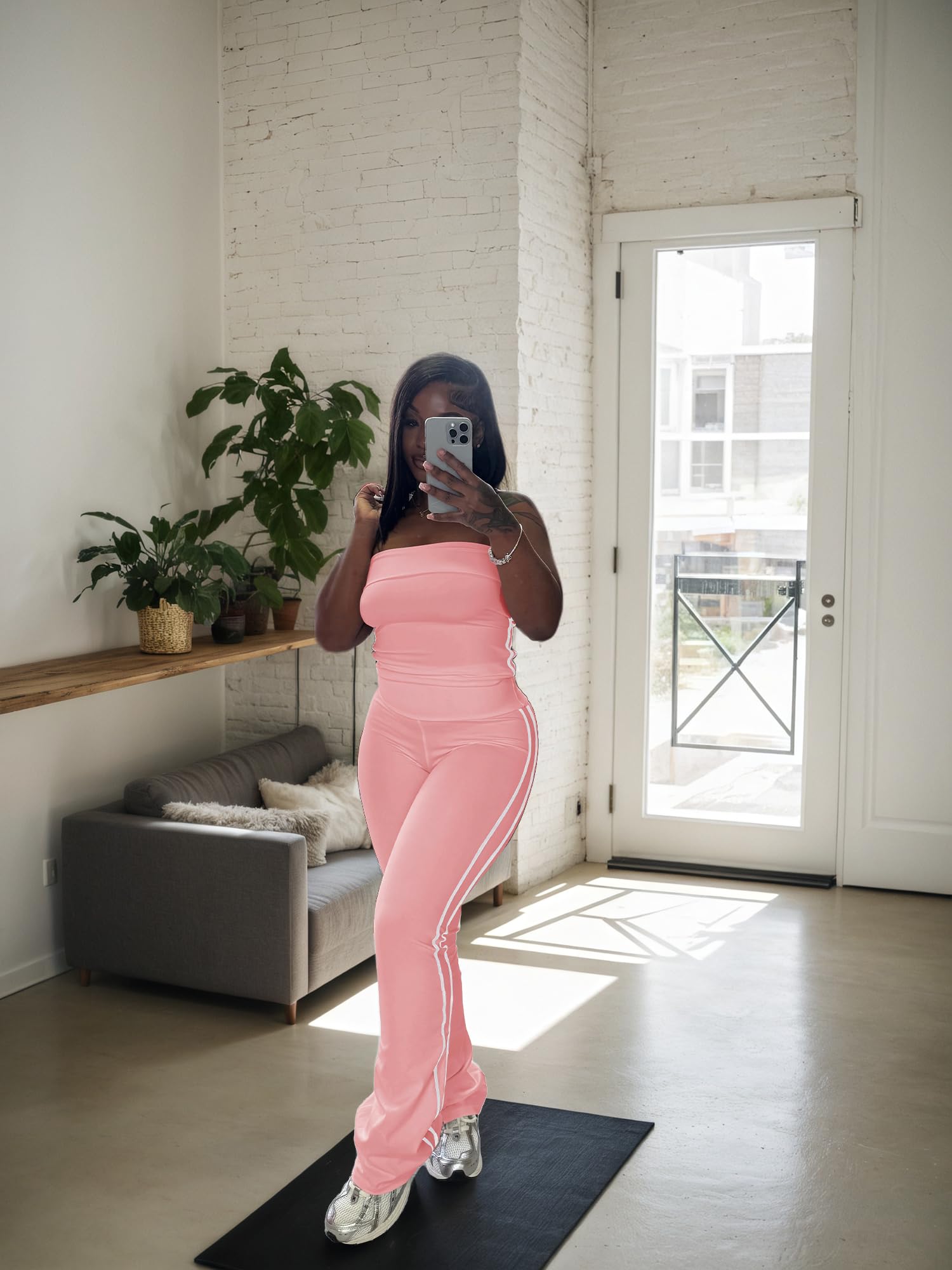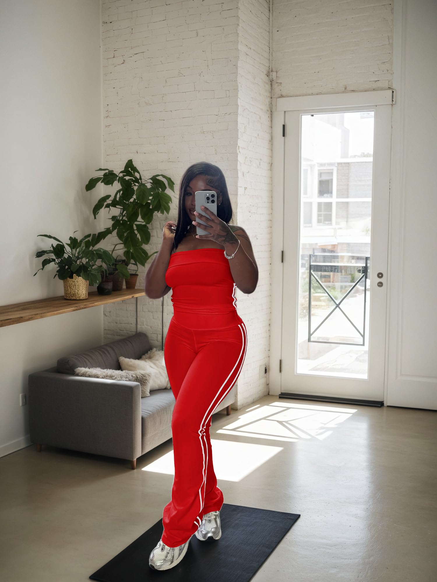 - Stylish Design:Trendy strapless crop top shows off shoulders, paired with striped flare pants. Combines fashion and freedom of movement. White stripes on the crop top and wide - leg pants add classic charm.
