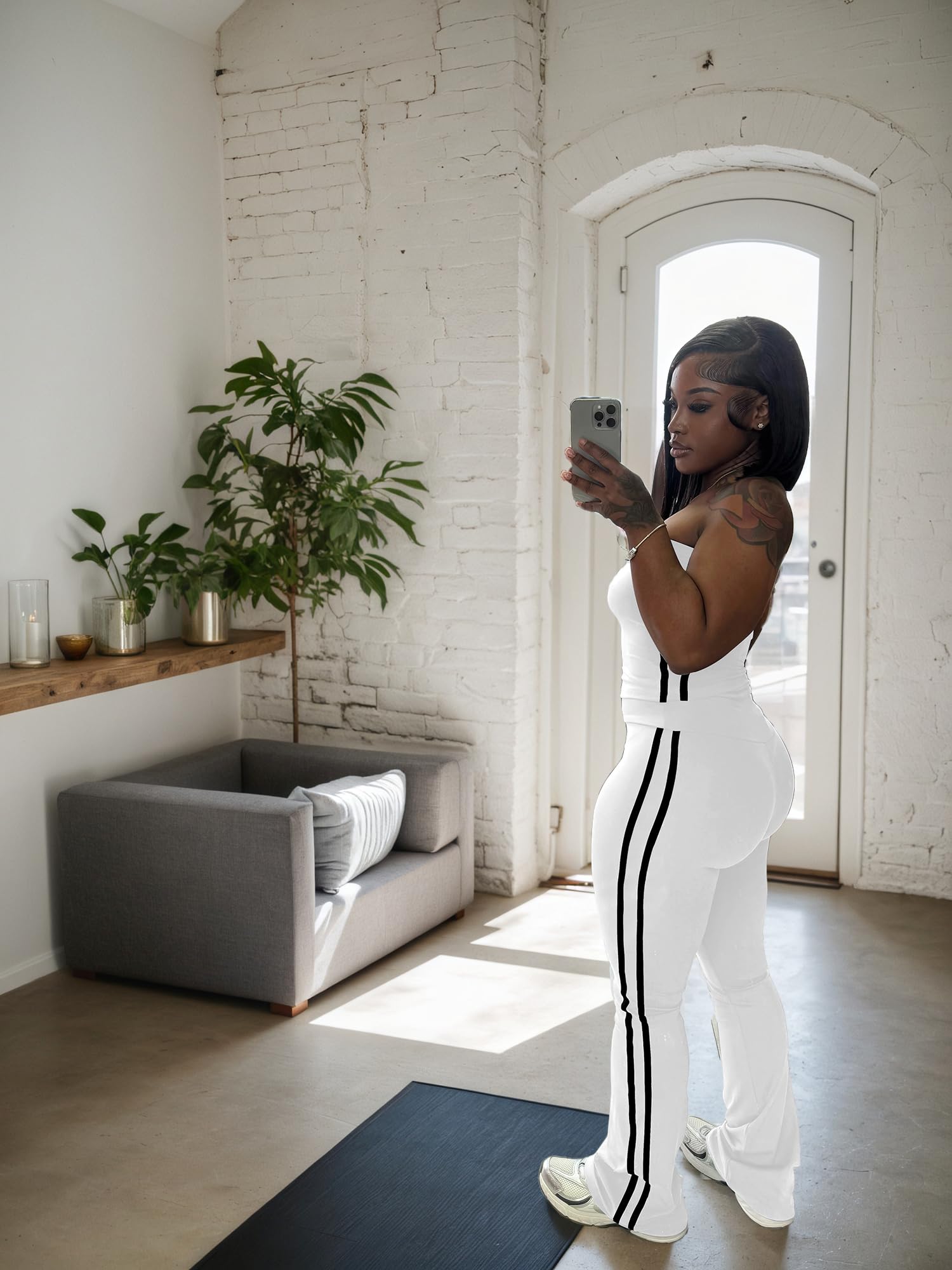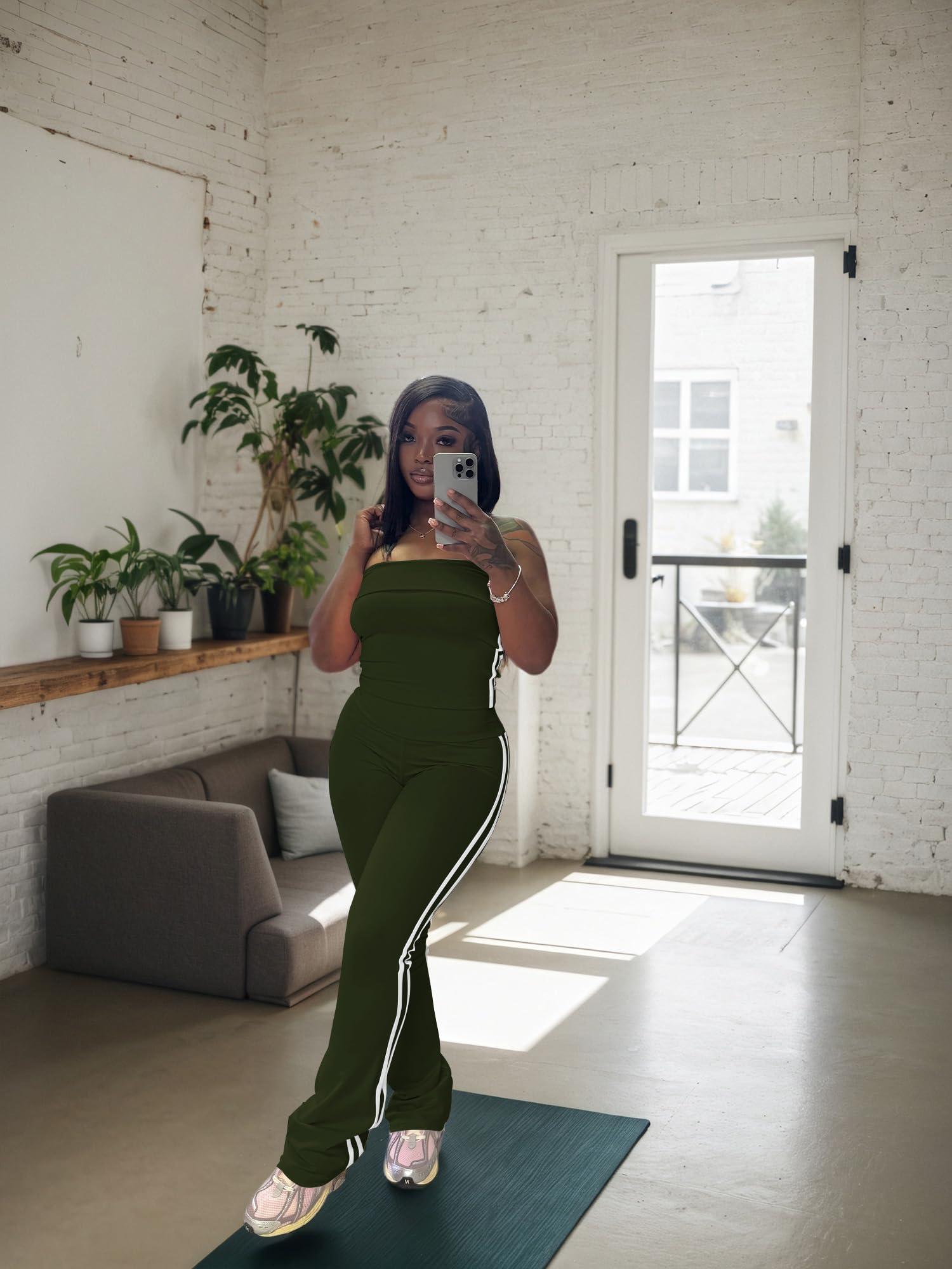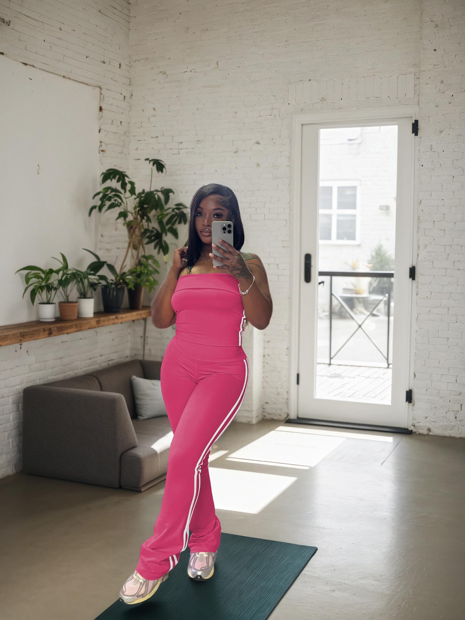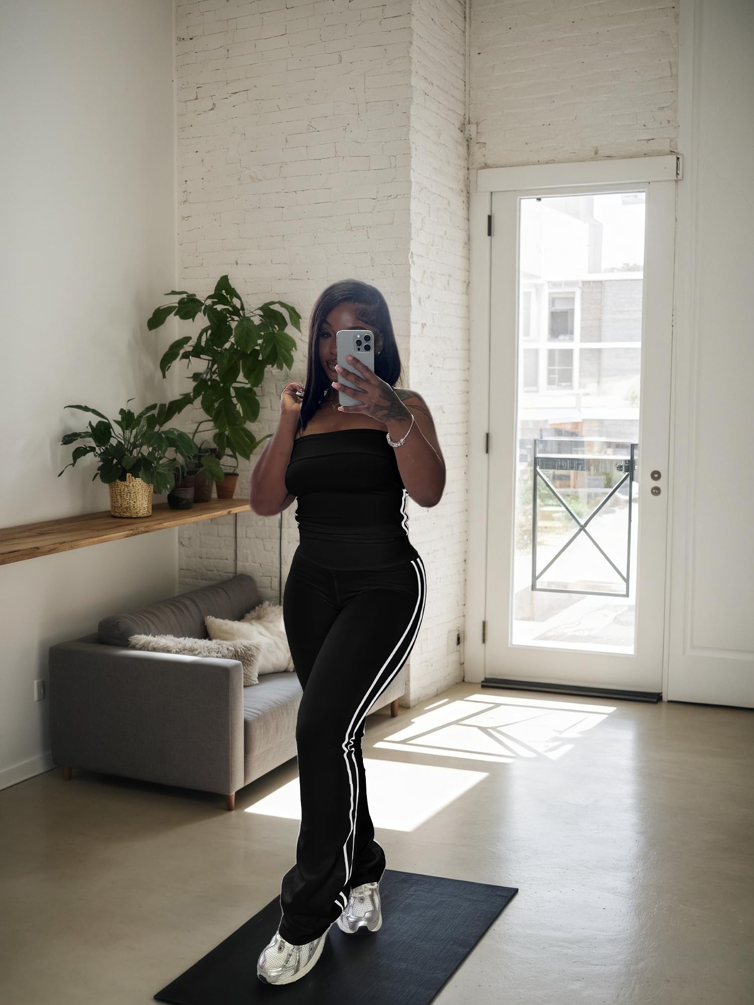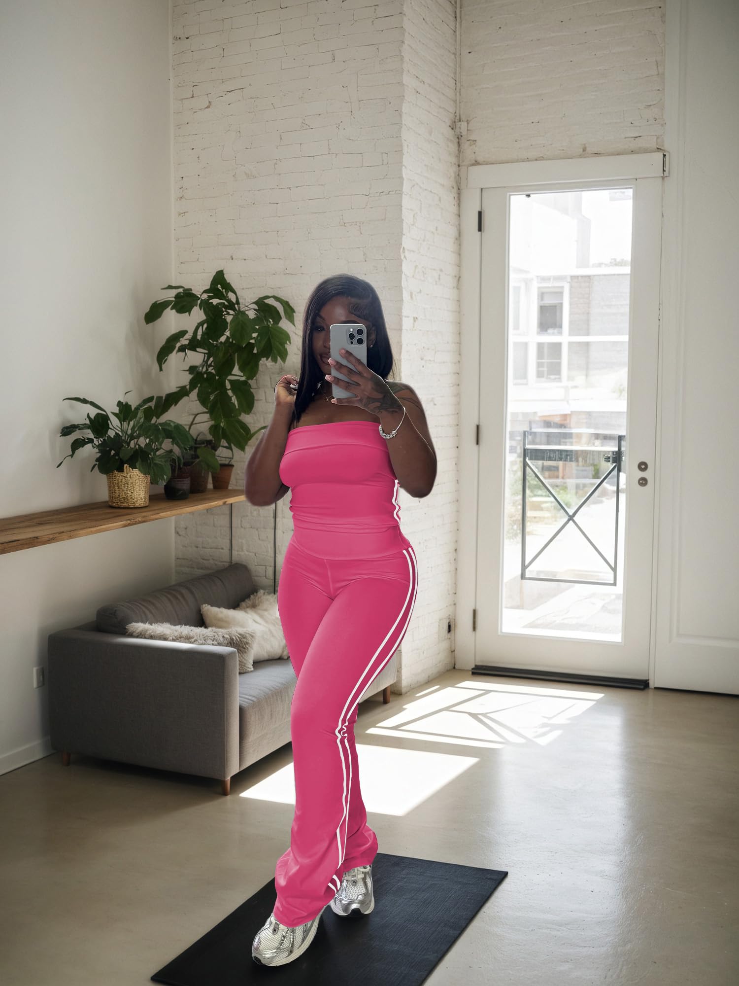 - Stylish Design:Trendy strapless crop top shows off shoulders, paired with striped flare pants. Combines fashion and freedom of movement. White stripes on the crop top and wide - leg pants add classic charm.