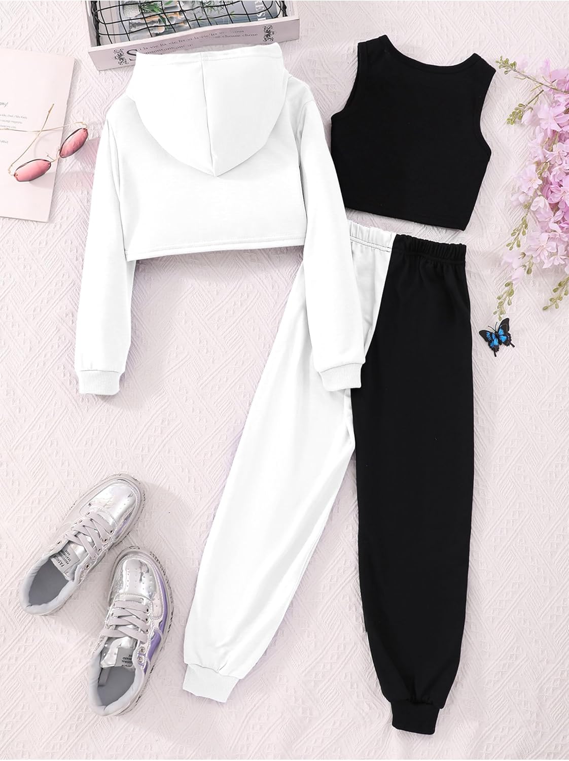 Girl Cute Graphic Long Sleeve Crop Hoodies and Slim Tank and Baggy Sweatpants Sets 3pcs Outfits