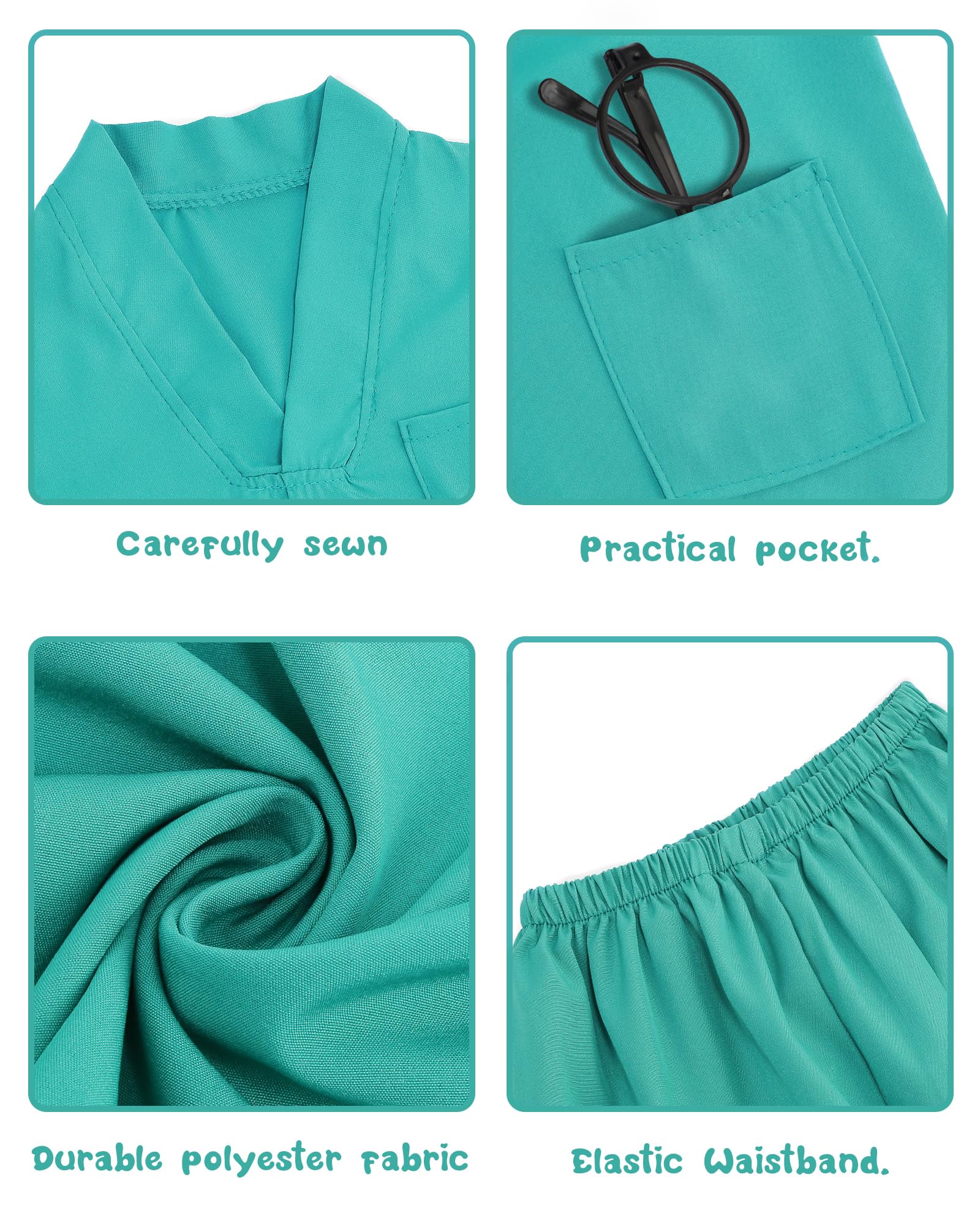 - Quality Material:Our kids scrubs costume are made of soft breathable materials.This kids nurse costume for boys girls features V-neck short-sleeved tops with three front pockets, elastic-waist pants,comfort easy to wear.6 sizes avalible for 3~11 year-old