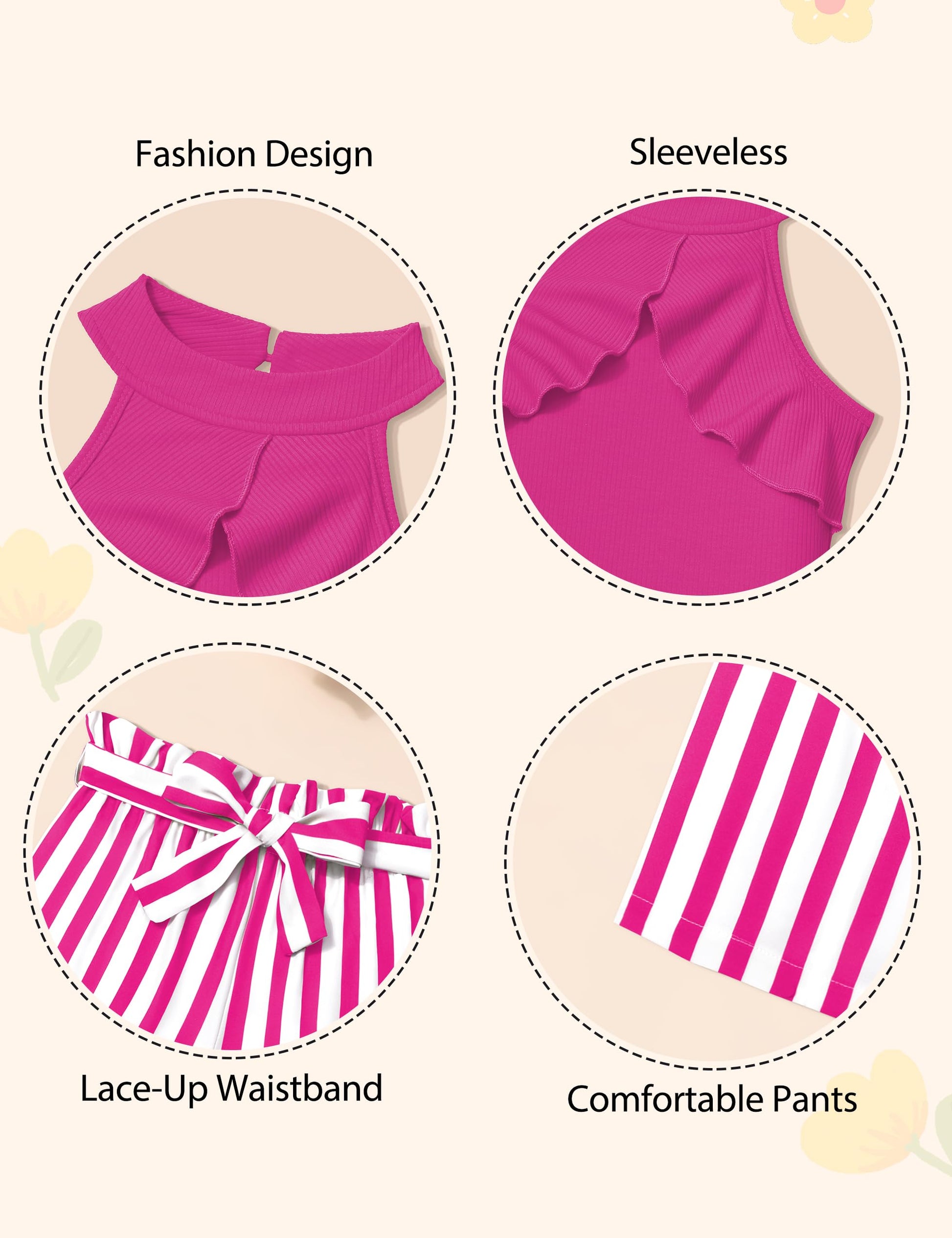 - 🌠【High Quality Material】Girls clothes is a delightful soft cherry blossom pink two piece set that will enhance your princess wardrobe.The sleeveless top boasts an innovative collar design, ensuring a secure fit for active girls. Crafted from 95% cotton and 5% polyester, The girl clothes offers both comfort and durability. Paired with pink and white striped shorts made from 102% polyester, this ensemble promises lasting quality and effortless.