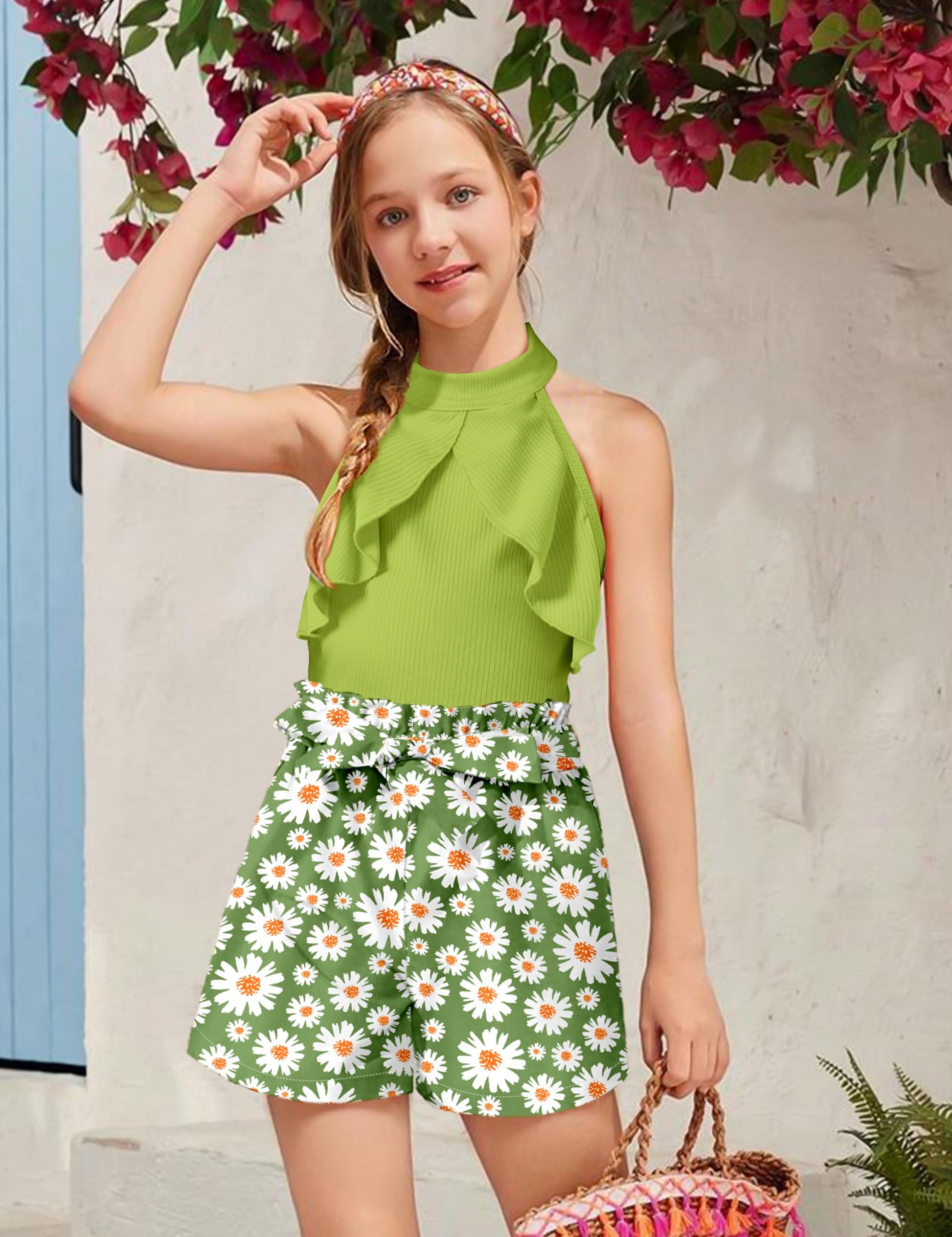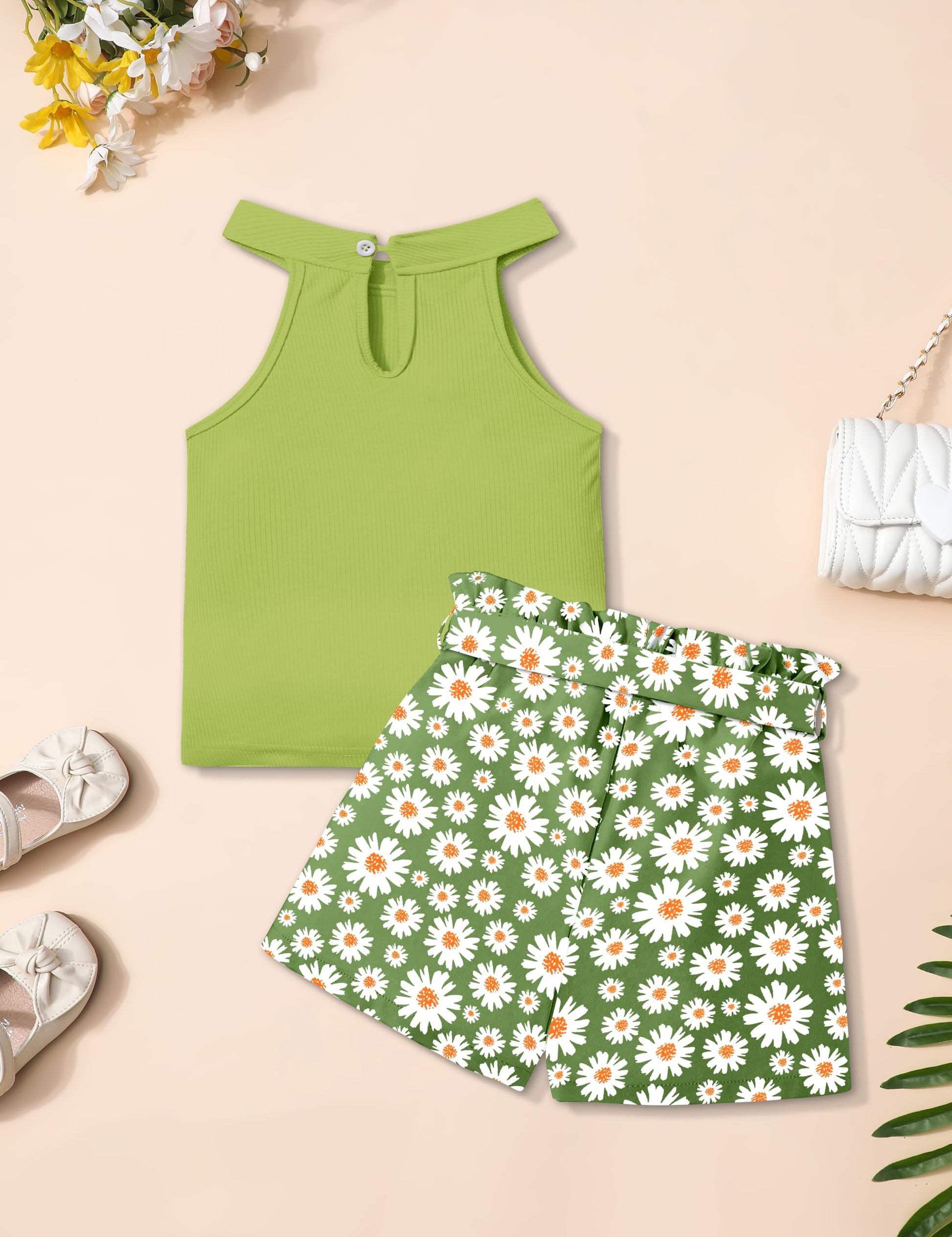 - 🌠【Fashion-Forward Design】Girls outfit are sets designed for fashion-savvy young trendsetters,The Halter Neck design of the sleeveless top not only prevents wardrobe malfunctions but also accentuates your girl's elegance and poise. Complemented by the charming butterfly bow tie belt adorning the shorts, every detail exudes sweetness and style, making it a must-have addition to any girl's wardrobe.