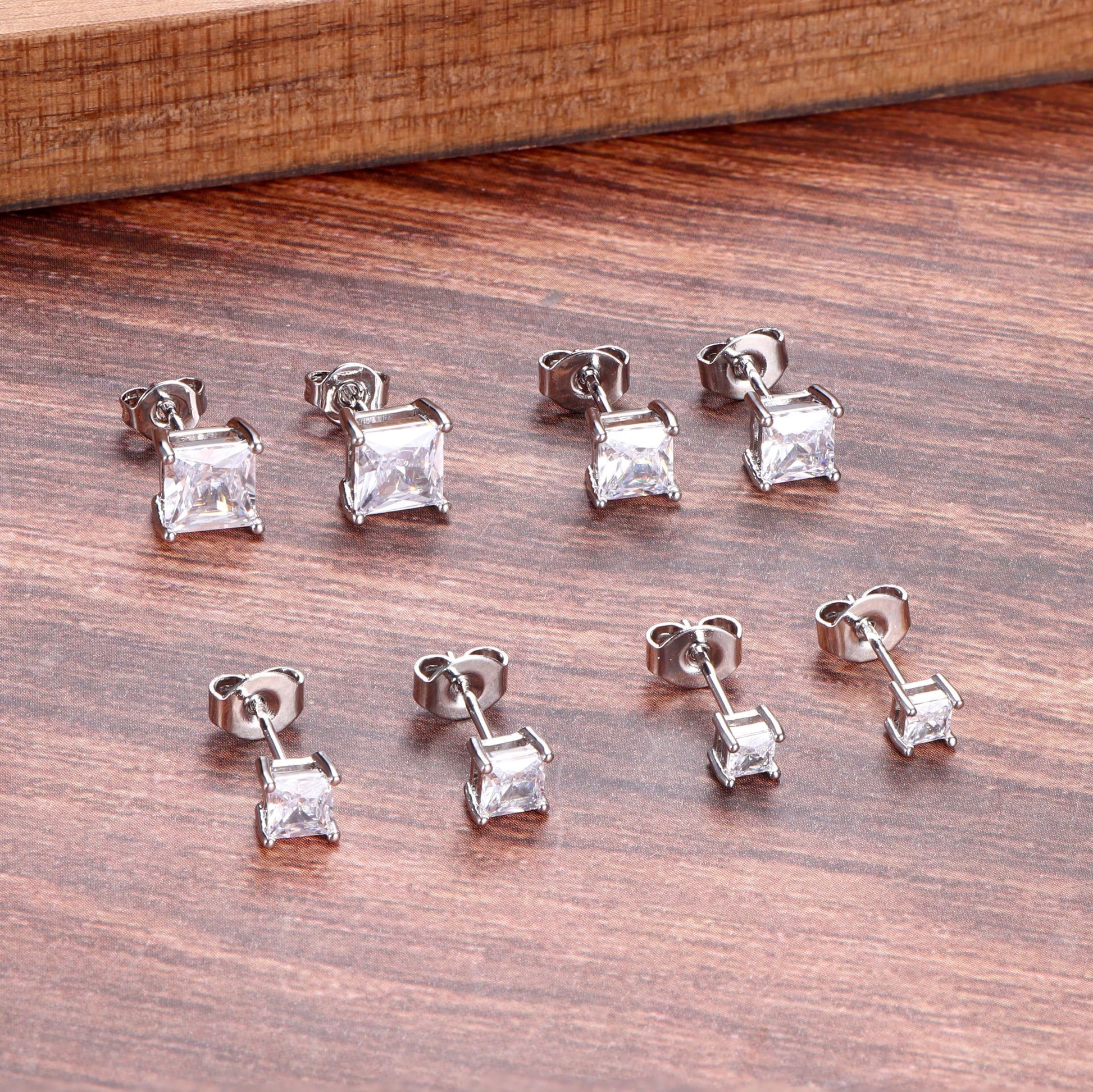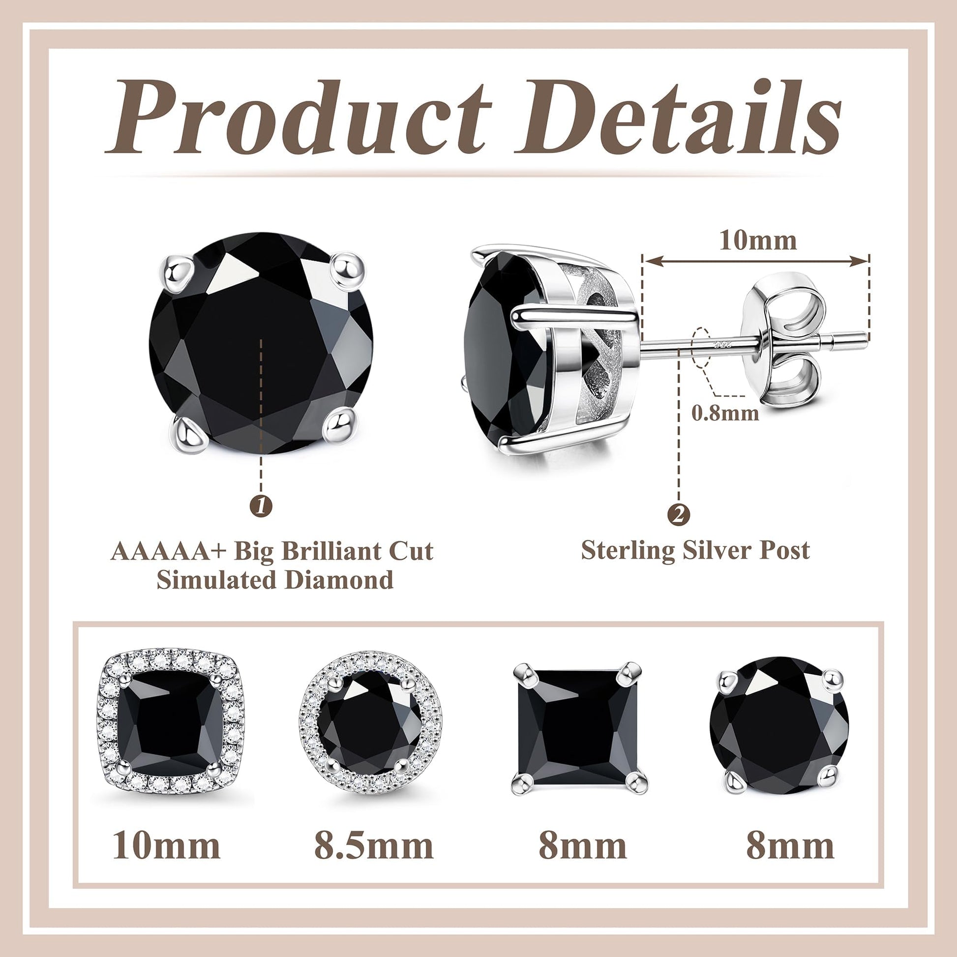 - Silver Stud Earrings Set: Sold by 4 pairs a set. 10mm post, standard size suitable for most people. Cubic Zirconia size approx 8mm-10mm. Brilliant cut CZ especially for person who want large studs that looks more eye-catching.