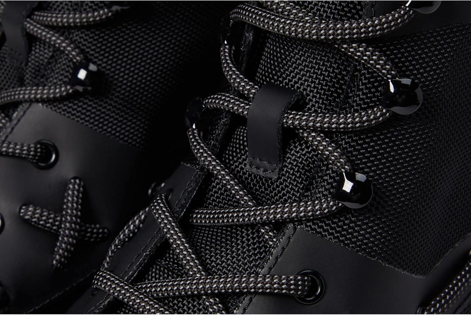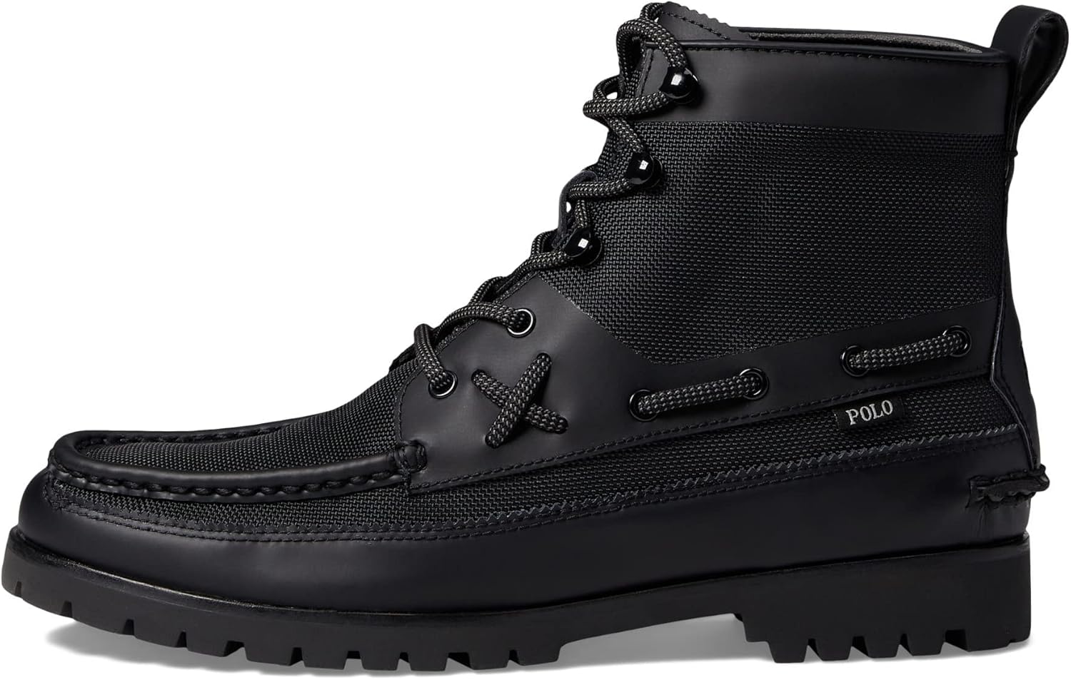 This utilitarian-inspired boot is constructed from durable coated leather and oxford with faux-leather trim. Detailed with tonal accents, it is finished with a hand-stitched toe and a leather welt.