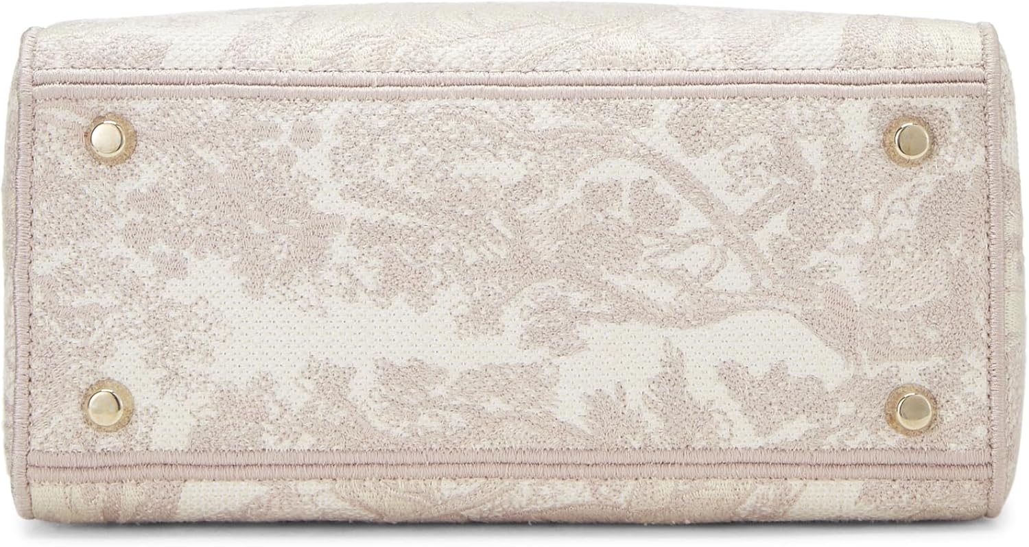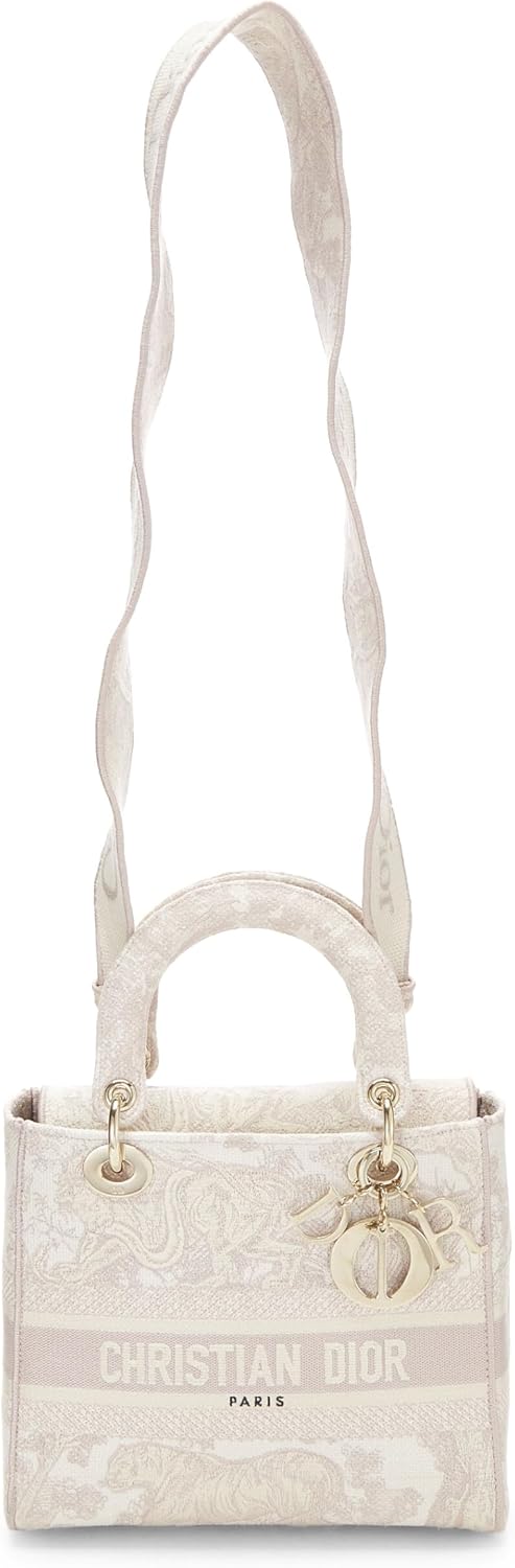 A rare new release from Dior, the medium Lady D-Lite bag is crafted in abstract animal embroidered canvas with tonal logo embroidery on front, finished with the signature gold-tone 'C' and 'D' logo charm hardware. In addition to two structured top handles, the bag includes a wide logo-jacquard canvas shoulder strap that's detachable for versatile carry.