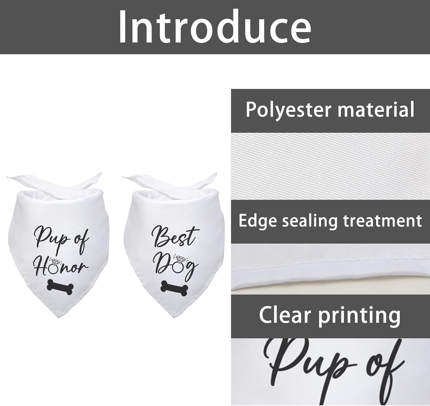 - [Engagement gifts for couples]:Cute 2pcsdog bandana engraved with:pup of honor,best dog, stylish font design and unique style make your pet look more cute and attractive.This is a cool engagement gift for your pet at a wedding. Also ideal as a dog bandana, breathable material to keep your dog cool on those hot summer days.
