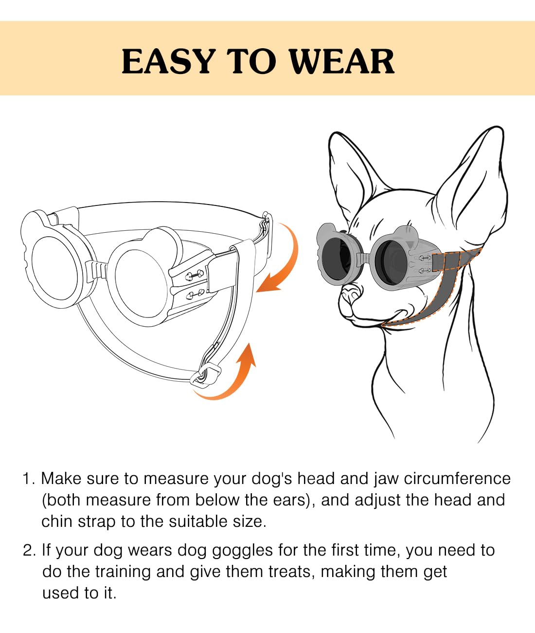 - 【Fit for】: Applicable head circumference: 18-29.5cm, applicable low jaw circumference: 13-22cm. Suitable for puppy, Yorkshire Terrier, Dachshund, Poodle, Shih Tzu, Miniature Schnauzer, Chihuahua, Pug, Pomeranian, Boston Terrier, Maltese, Teddy, Bichon Frise, Shorthair, Balinese, etc. (Please measure dog head and jaw size before ordering dog sunglasses.)