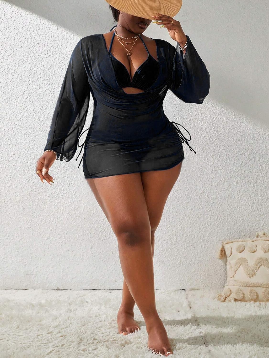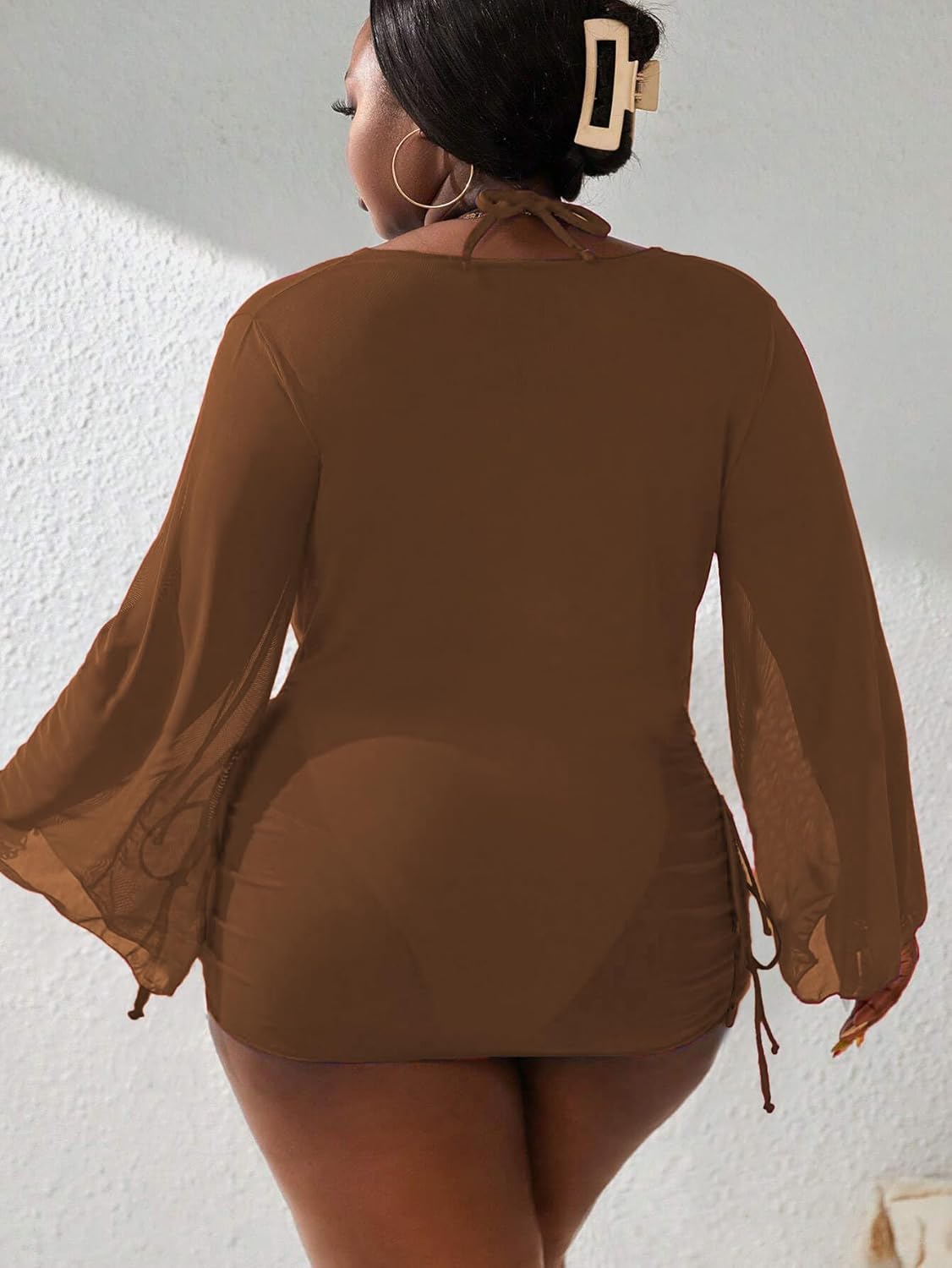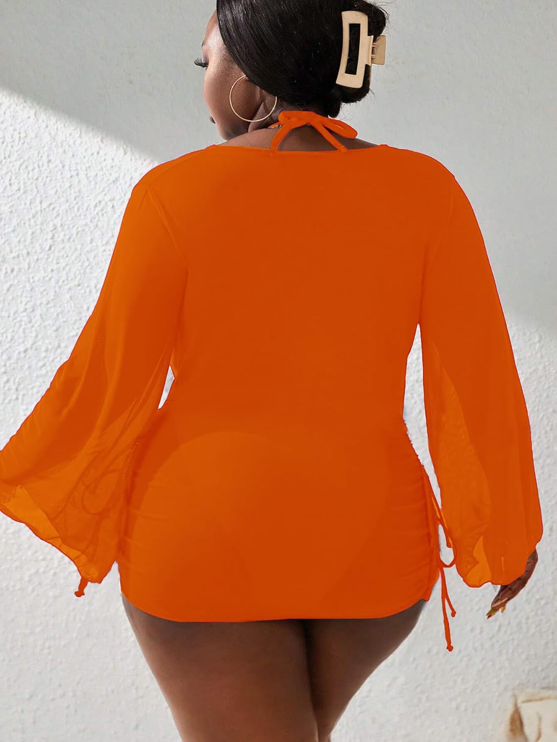 - Plus Size 3 Piece Swimsuit with Cover Up: The full coverage long sleeve sheer chiffon cover up provides effective sun protection and protects the skin from UV rays. The design of the cover up side ruched drawstring ties can be adjusted to elasticize and tighten at will, perfect for tummy control.