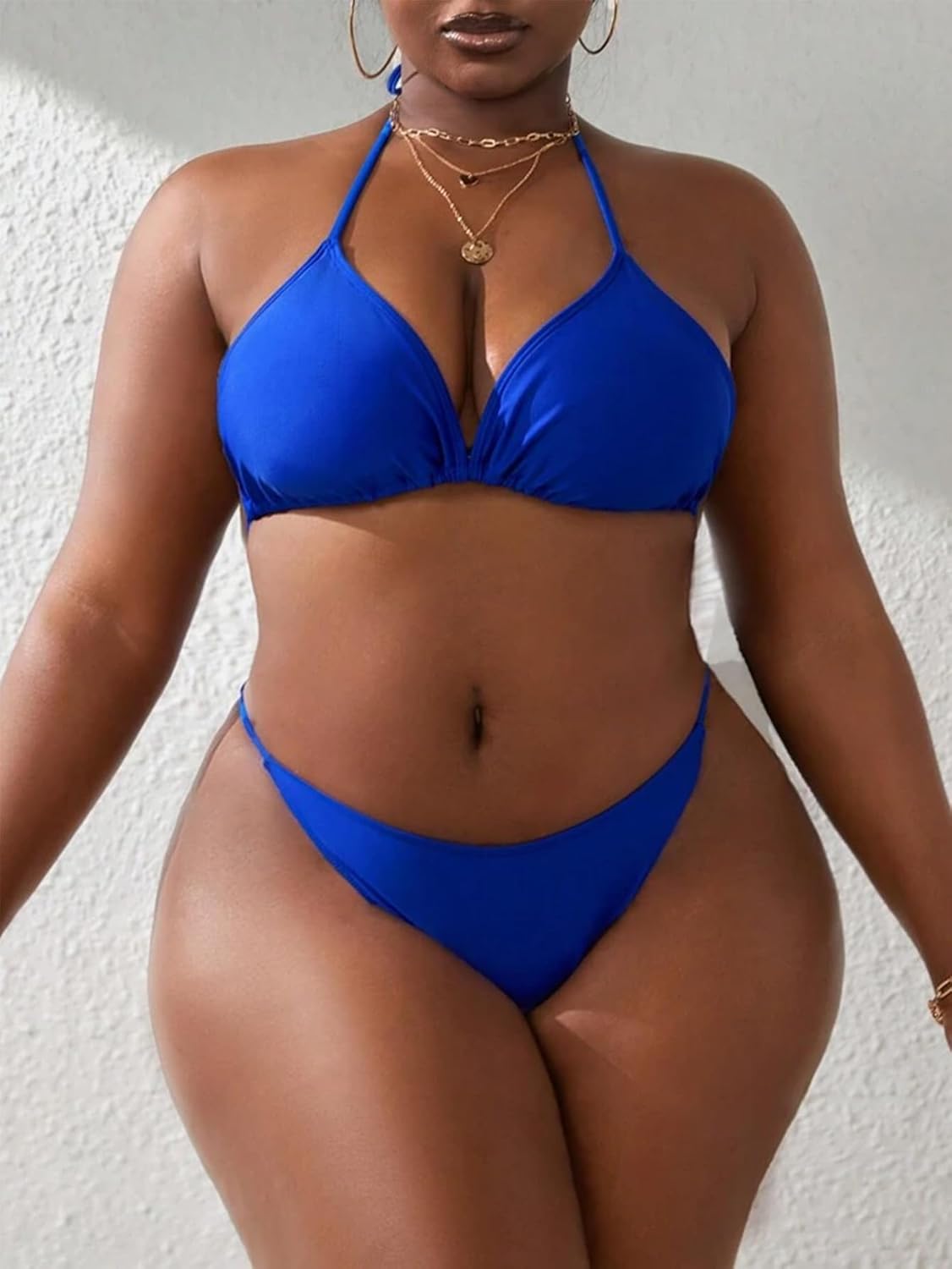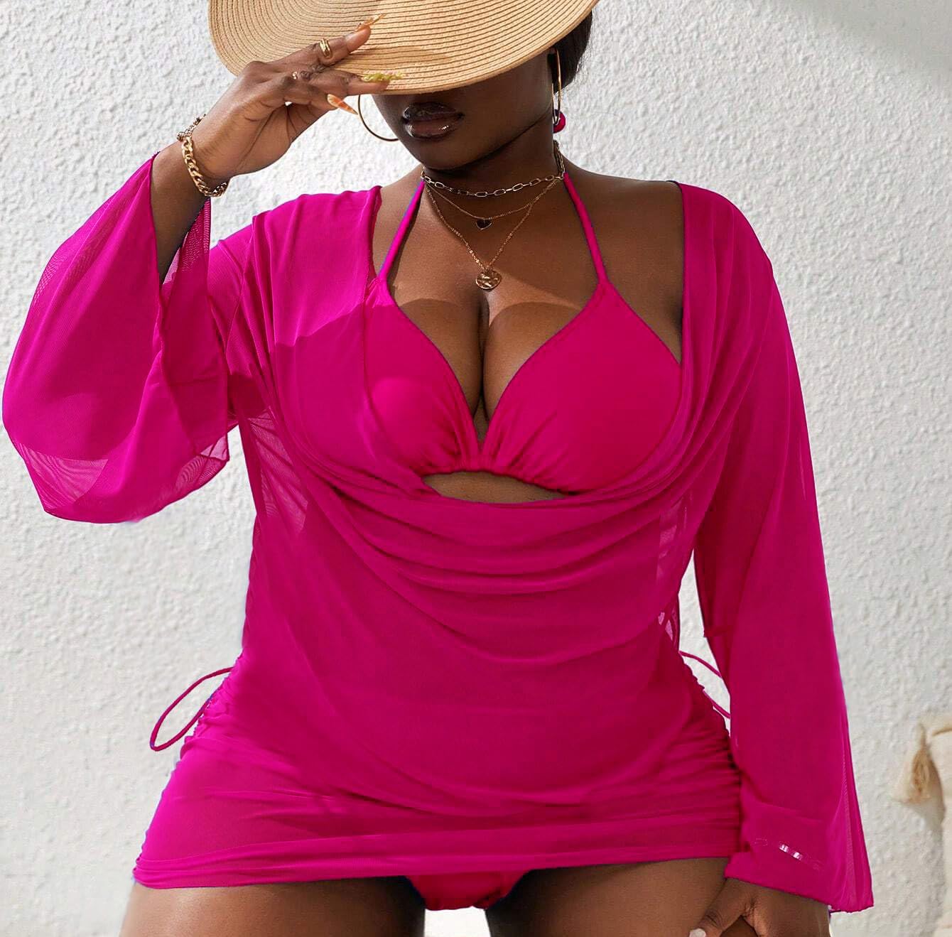 - Plus Size 3 Piece Swimsuit: The plus size swimsuit for women includes a bikini cover up, halter string triangle bikini top and mid rise bikini bottom.